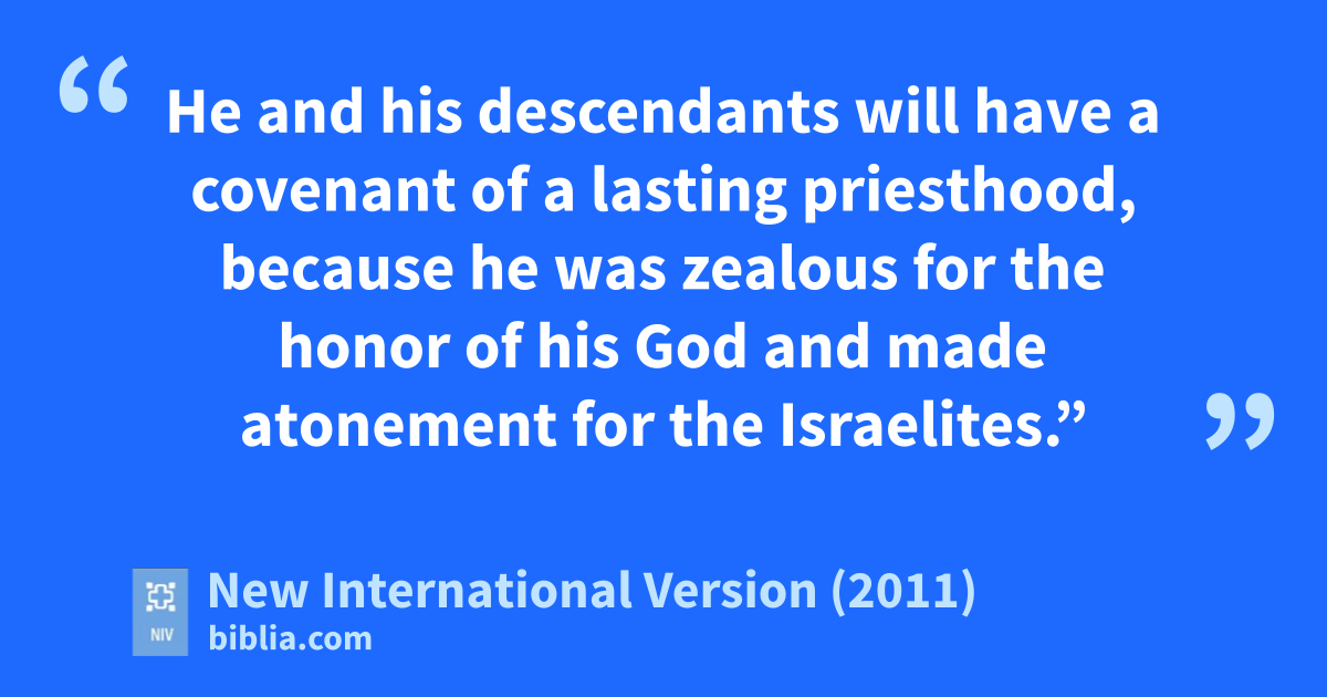 10 The Lord said to Moses, 11 “Phinehas son of Eleazar, the son of Aaron, the priest, has turned my anger away from the Israelites.z Since he was as zealous for my honora among them as I am, I did not put an end to them in my zeal. 12 Therefore tell him I am making my covenant of peaceb with him. 13 He and his descendants will have a covenant of a lasting priesthood,c because he was zealousd for the honore of his God and made atonementf for the Israelites.”g