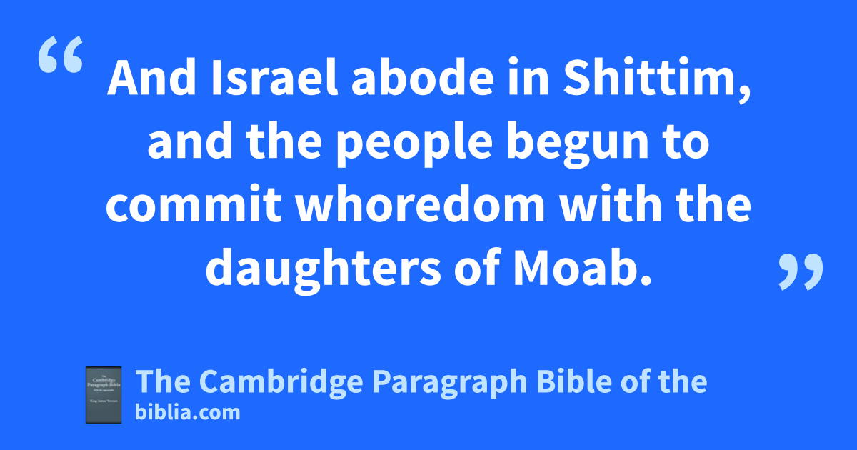 XXV. And Israel abode in aShittim, and bthe people begun to commit whoredom with the daughters of Moab. 2 cAnd they dcalled the people unto the sacrifices of their gods: and the people did eat, and bowed down to their gods. 3 And Israel ejoined himself unto fBaal-peor: and the anger of the Lord was kindled against Israel. 4 And the Lord said unto Moses, gTake all the heads of the people, and hang them up before the Lord against the sun, hthat the fierce anger of the Lord may be turned away from Israel. 5 And Moses said unto ithe judges of Israel, kSlay ye every one his men that were joined unto fBaal-peor. 6 And behold, one of the children of Israel came and brought unto his brethren a Midianitish woman in the sight of Moses, and in the sight of all the congregation of the children of Israel, who were lweeping before the door of the tabernacle of the congregation. 7 And mwhen Phinehas, nthe son of Eleazar, the son of Aaron the priest, saw it, he rose up from amongst the congregation, and took a javelin in his hand; 8 and he went after the man of Israel into the tent, and thrust both of them through, the man of Israel, and the woman through her belly. So othe plague was stayed from the children of Israel. 9 And pthose that died in the plague were twenty and four thousand.
