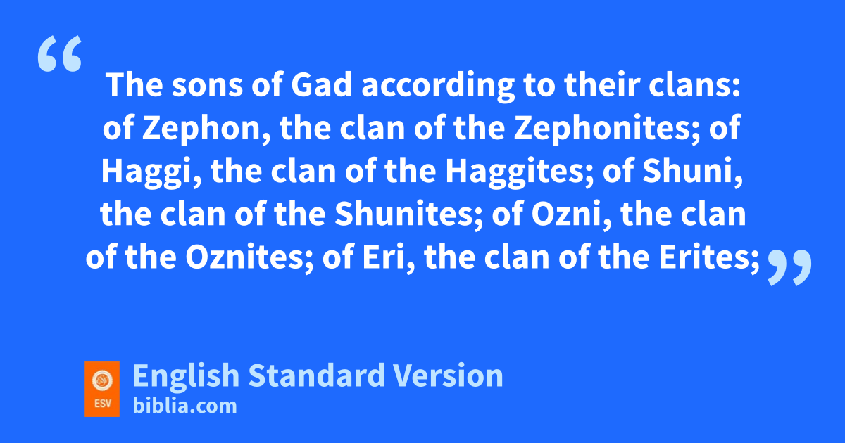 15 The sons of lGad according to their clans: of Zephon, the clan of the Zephonites; of Haggi, the clan of the Haggites; of Shuni, the clan of the Shunites; 16 of Ozni, the clan of the Oznites; of Eri, the clan of the Erites; 17 of Arod, the clan of the Arodites; of Areli, the clan of the Arelites. 18 These are the clans of the sons of Gad as they were listed, m40,500.