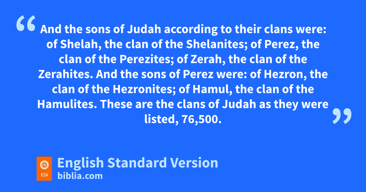 19 The sons of nJudah were Er and Onan; and Er and Onan died in the land of Canaan. 20 And the sons of Judah according to their clans were: of Shelah, the clan of the Shelanites; of Perez, the clan of the Perezites; of Zerah, the clan of the Zerahites. 21 And the sons of Perez were: of Hezron, the clan of the Hezronites; of Hamul, the clan of the Hamulites. 22 These are the clans of Judah as they were listed, o76,500.