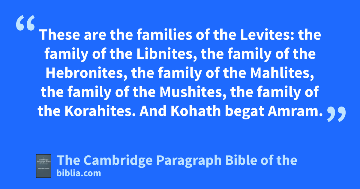 57 nAnd these are they that were numbered of the Levites after their families: of Gershon, the family of the Gershonites: of Kohath, the family of the Kohathites: of Merari, the family of the Merarites. 58 These are the families of the Levites: the family of the Libnites, the family of the Hebronites, the family of the Mahlites, the family of the Mushites, the family of the Korahites. And Kohath begat Amram. 59 And the name of Amram’s wife was oJochebed, the daughter of Levi, whom her mother bare to Levi in Egypt: and she bare unto Amram Aaron and Moses, and Miriam their sister. 60 pAnd unto Aaron was born Nadab, and Abihu, Eleazar, and Ithamar. 61 And qNadab and Abihu died, when they offered strange fire before the Lord. 62 And those that were numbered of them were rtwenty and three thousand, all males from a month old and upward: sfor they were not numbered among the children of Israel, because there was tno inheritance given them among the children of Israel. 63 These are they that were numbered by Moses and Eleazar the priest, who numbered the children of Israel uin the plains of Moab by Jordan near Jericho. 64 xBut among these there was not a man of them whom Moses and Aaron the priest numbered, when they numbered the children of Israel in the wilderness of Sinai. 65 For the Lord had said of them, They yshall surely die in the wilderness. And there was not left a man of them, zsave Caleb the son of Jephunneh, and Joshua the son of Nun.