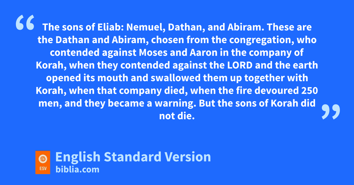 5 dReuben, the firstborn of Israel; the sons of Reuben: of Hanoch, the clan of the Hanochites; of Pallu, the clan of the Palluites; 6 of Hezron, the clan of the Hezronites; of Carmi, the clan of the Carmites. 7 These are the clans of the Reubenites, and those listed were e43,730. 8 And the sons of Pallu: Eliab. 9 The sons of Eliab: Nemuel, Dathan, and Abiram. These are the Dathan and Abiram, fchosen from the congregation, who contended against Moses and Aaron in the company of Korah, when they contended against the Lord 10 and gthe earth opened its mouth and swallowed them up together with Korah, when that company died, when the fire devoured 250 men, and hthey became a warning. 11 But ithe sons of Korah did not die.