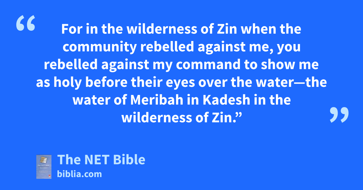 27:12 13 Then the Lord said to Moses, “Go up this mountain of the Abarim range,14 and see15 the land I have given16 to the Israelites. 27:13 When you have seen it, you will be gathered17 to your ancestors,18 as Aaron your brother was gathered to his ancestors.19 27:14 For20 in the wilderness of Zin when the community rebelled against me, you21 rebelled against my command22 to show me as holy23 before their eyes over the water—the water of Meribah in Kadesh in the wilderness of Zin.”