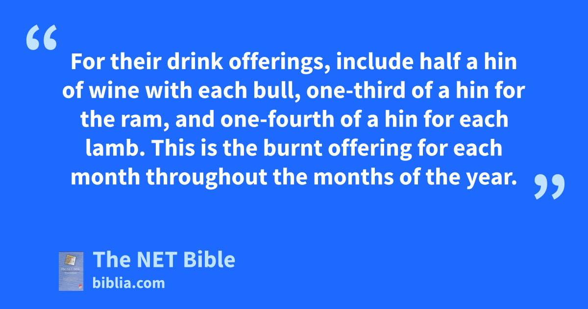 28:11 “ ‘On the first day of each month16 you must offer as a burnt offering to the Lord two young bulls, one ram, and seven unblemished lambs a year old, 28:12 with three-tenths of an ephah of finely ground flour mixed with olive oil as a grain offering for each bull, and two-tenths of an ephah of finely ground flour mixed with olive oil as a grain offering for the ram, 28:13 and one-tenth of an ephah of finely ground flour mixed with olive oil as a grain offering for each lamb, as a burnt offering for a pleasing aroma, an offering made by fire to the Lord. 28:14 For their drink offerings, include17 half a hin of wine with each bull, one-third of a hin for the ram, and one-fourth of a hin for each lamb. This is the burnt offering for each month18 throughout the months of the year. 28:15 And one male goat19 must be offered to the Lord as a purification offering, in addition to the continual burnt offering and its drink offering.