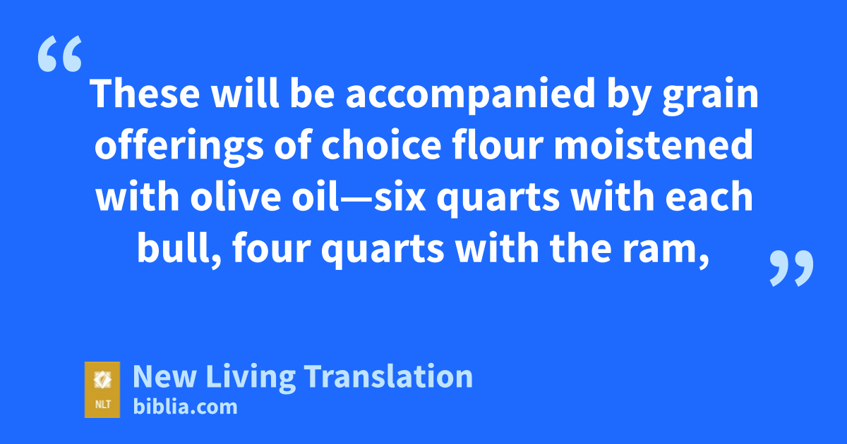 11 “On the first day of each month, present an extra burnt offering to the Lord of two young bulls, one ram, and seven one-year-old male lambs, all with no defects. 12 These must be accompanied by grain offerings of choice flour moistened with olive oil—six quarts* with each bull, four quarts with the ram, 13 and two quarts with each lamb. This burnt offering will be a special gift, a pleasing aroma to the Lord. 14 You must also present a liquid offering with each sacrifice: two quarts* of wine for each bull, a third of a gallon* for the ram, and one quart* for each lamb. Present this monthly burnt offering on the first day of each month throughout the year.