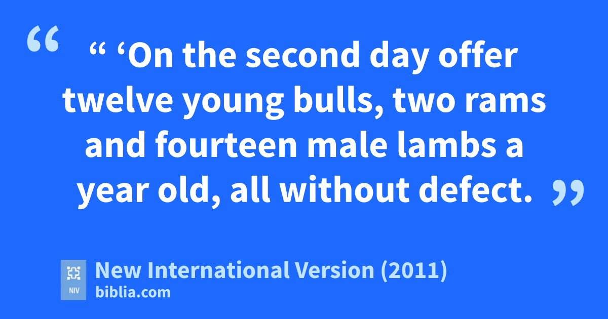 17 “ ‘On the second dayw offer twelve young bulls, two rams and fourteen male lambs a year old, all without defect.x 18 With the bulls, rams and lambs, offer their grain offeringsy and drink offeringsz according to the number specified.a 19 Include one male goat as a sin offering,b in addition to the regular burnt offeringc with its grain offering, and their drink offerings.d
