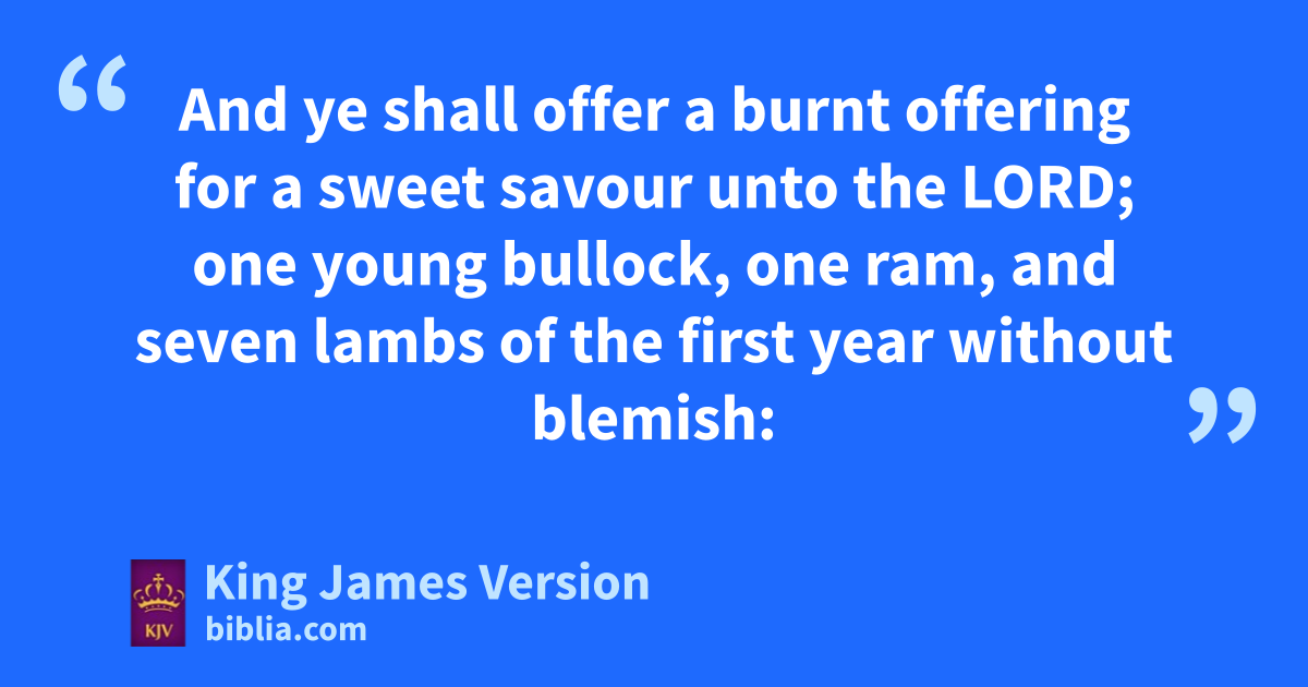 29 And in the seventh month, on the first day of the month, ye shall have an holy convocation; ye shall do no servile work: ait is a day of blowing the trumpets unto you. 2 And ye shall offer a burnt offering for a sweet savour unto the Lord; one young bullock, one ram, and seven lambs of the first year without blemish: 3 And their meat offering shall be of flour mingled with oil, three tenth deals for a bullock, and two tenth deals for a ram, 4 And one tenth deal for one lamb, throughout the seven lambs: 5 And one kid of the goats for a sin offering, to make an atonement for you: 6 Beside bthe burnt offering of the month, and his meat offering, and cthe daily burnt offering, and his meat offering, and their drink offerings, according unto their manner, for a sweet savour, a sacrifice made by fire unto the Lord. 7 And dye shall have on the tenth day of this seventh month an holy convocation; and ye shall eafflict your souls: ye shall not do any work therein: 8 But ye shall offer a burnt offering unto the Lord for a sweet savour; one young bullock, one ram, and seven lambs of the first year; fthey shall be unto you without blemish: 9 And their meat offering shall be of flour mingled with oil, three tenth deals to a bullock, and two tenth deals to one ram, 10 A several tenth deal for one lamb, throughout the seven lambs: 11 gOne kid of the goats for a sin offering; beside hthe sin offering of atonement, and the continual burnt offering, and the meat offering of it, and their drink offerings.