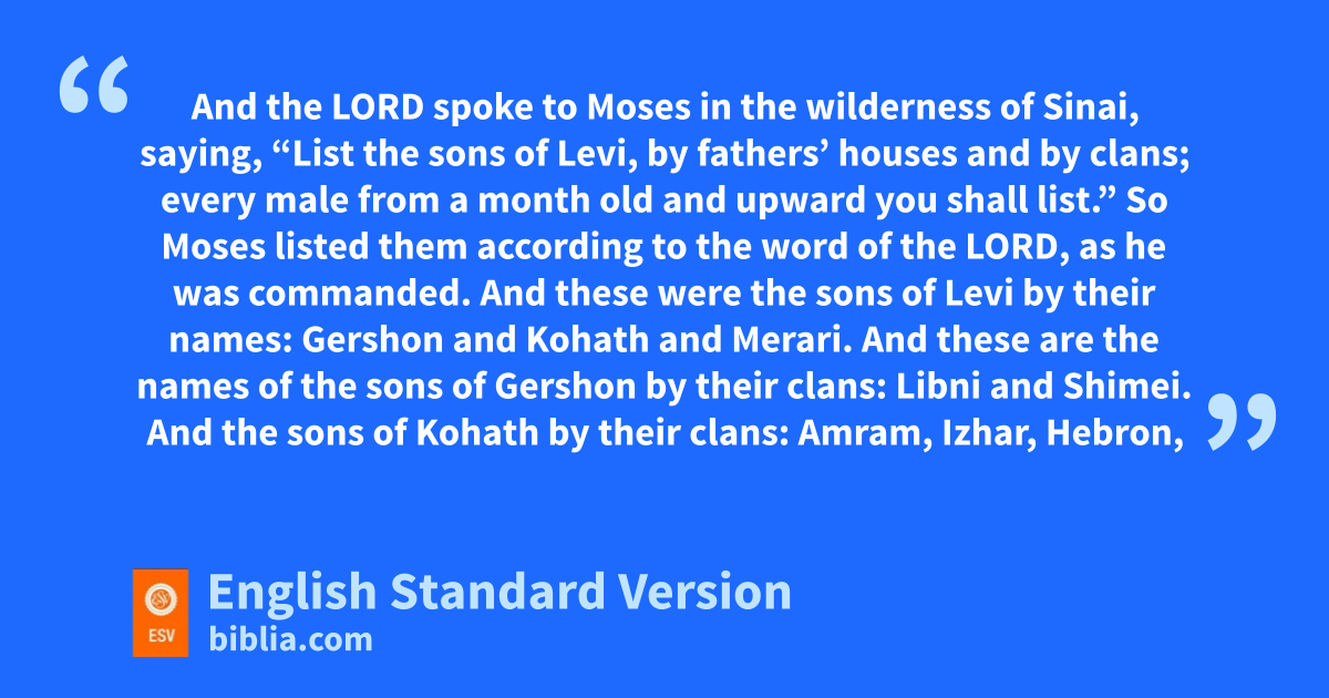 14 And the Lord spoke to Moses in the wilderness of Sinai, saying, 15 “List the sons of Levi, by fathers’ houses and by clans; qevery male from a month old and upward you shall list.” 16 So Moses listed them according to the word of the Lord, as he was commanded. 17 rAnd these were the sons of Levi by their names: Gershon and Kohath and Merari. 18 And these are the names of the sons of Gershon by their clans: sLibni and Shimei. 19 And the sons of Kohath by their clans: tAmram, Izhar, Hebron, and Uzziel. 20 And the sons of Merari by their clans: uMahli and Mushi. These are the clans of the Levites, by their fathers’ houses.