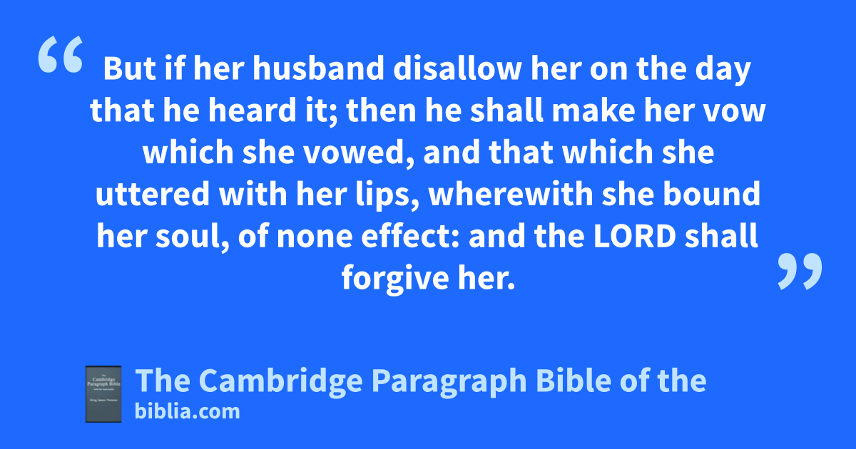 XXX. And Moses spake unto athe heads of the tribes concerning the children of Israel, saying, This is the thing which the Lord hath commanded. 2 bIf a man vow a vow unto the Lord, or cswear an oath to bind his soul with a bond; he shall not * break his word, he shall ddo according to all that proceedeth out of his mouth. 3 If a woman also vow a vow unto the Lord, and bind herself by a bond, being in her father’s house in her youth; 4 and her father hear her vow, and her bond wherewith she hath bound her soul, and her father shall hold his peace at her: then all her vows shall stand, and every bond wherewith she hath bound her soul shall stand. 5 But if her father disallow her in the day that he heareth; not any of her vows, or of her bonds wherewith she hath bound her soul, shall stand: and the Lord shall forgive her, because her father disallowed her. 6 And if she had at all a husband, when * she vowed, or uttered ought out of her lips, wherewith she bound her soul; 7 and her husband heard it, and held his peace at her in the day that he heard it: then her vows shall stand, and her bonds wherewith she bound her soul shall stand. 8 But if her husband disallow her on the day that he heard it; then he shall make her vow which she vowed, and that which she uttered with her lips, wherewith she bound her soul, of none effect: and the Lord shall forgive her. 9 But every vow of a widow, and of her that is divorced, wherewith they have bound their souls, shall stand against her. 10 And if she vowed in her husband’s house, or bound her soul by a bond with an oath; 11 and her husband heard it, and held his peace at her, and disallowed her not: then all her vows shall stand, and every bond wherewith she bound her soul shall stand. 12 But if her husband hath utterly made them void on the day he heard them; then whatsoever proceeded out of her lips concerning her vows, or concerning the bond of her soul, shall not stand: her husband hath made them void; and the Lord shall forgive her. 13 Every vow, and every binding oath to afflict the soul, her husband may establish it, or her husband may make it void. 14 But if her husband altogether hold his peace at her from day to day; then he establisheth all her vows, or all her bonds, which are upon her: he confirmeth them, because he held his peace at her in the day that he heard them. 15 But if he shall any ways make them void after that he hath heard them; then ehe shall bear her iniquity. 16 These are the statutes, which the Lord commanded Moses, between a man and his wife, between the father and his daughter, being yet in her youth in her father’s house.