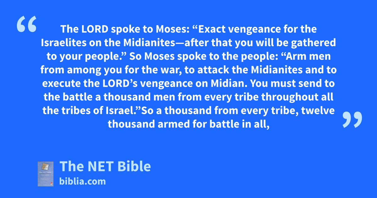 31:3 So Moses spoke to the people: “Arm5 men from among you for the war, to attack the Midianites and to execute6 the Lord’s vengeance on Midian. 31:4 You must send to the battle a thousand men from every tribe throughout all the tribes of Israel.”7 31:5 So a thousand from every tribe, twelve thousand armed for battle in all, were provided out of the thousands of Israel.