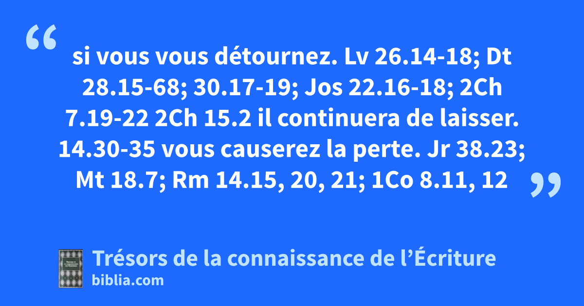 si vous vous détournez. Lv 26.14-18; Dt 28.15-68; 30.17-19; Jos 22.16-18; 2Ch 7.19-22 2Ch 15.2 il continuera de laisser. 14.30-35 vous causerez la perte. Jr 38.23; Mt 18.7; Rm 14.15, 20, 21; 1Co 8.11, 12