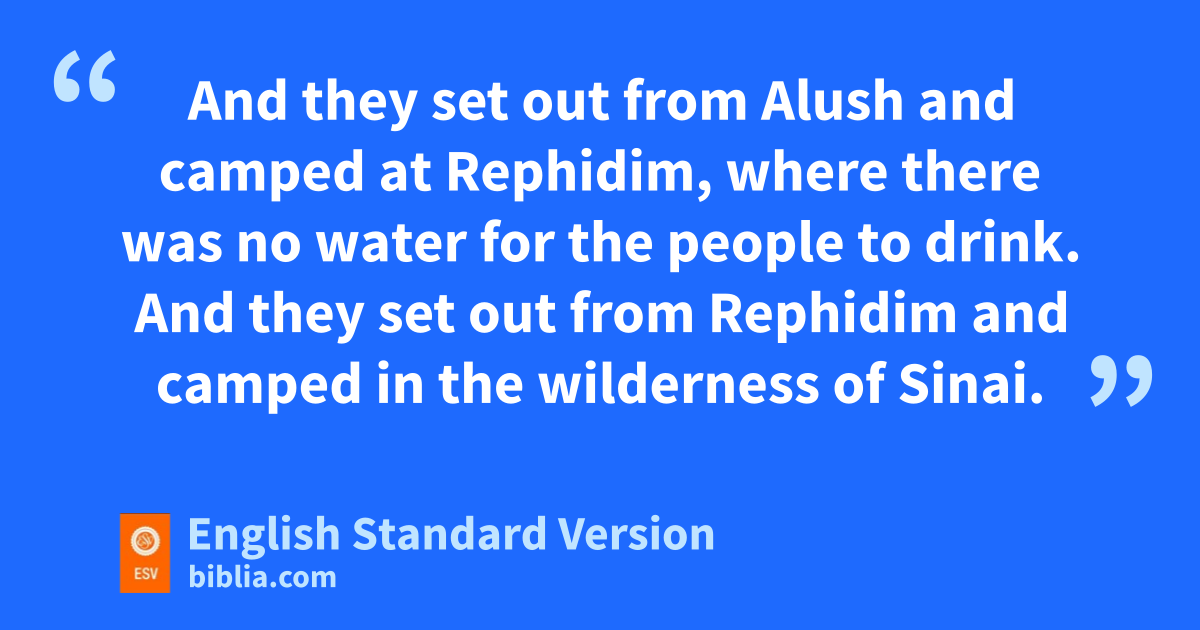 5 So the people of Israel set out from Rameses and camped at rSuccoth. 6 And they set out from Succoth and camped at sEtham, which is on the edge of the wilderness. 7 And they set out from Etham and turned back to tPi-hahiroth, which is east of Baal-zephon, and they camped before Migdol. 8 And they set out from before Hahiroth1 and upassed through the midst of the sea into the wilderness, and they vwent a three days’ journey in the wilderness of Etham and camped at Marah. 9 And they set out from Marah and came to wElim; at Elim there were twelve springs of water and seventy palm trees, and they camped there. 10 And they set out from Elim and camped by the Red Sea. 11 And they set out from the Red Sea and camped in xthe wilderness of Sin. 12 And they set out from the wilderness of Sin and camped at Dophkah. 13 And they set out from Dophkah and camped at Alush. 14 And they set out from Alush and camped at yRephidim, where there was no water for the people to drink. 15 And they set out from Rephidim and camped in the zwilderness of Sinai. 16 And they set out from the wilderness of Sinai and camped at aKibroth-hattaavah. 17 And they set out from Kibroth-hattaavah and camped at bHazeroth. 18 And they cset out from Hazeroth and camped at Rithmah. 19 And they set out from Rithmah and camped at Rimmon-perez. 20 And they set out from Rimmon-perez and camped at Libnah. 21 And they set out from Libnah and camped at Rissah. 22 And they set out from Rissah and camped at Kehelathah. 23 And they set out from Kehelathah and camped at Mount Shepher. 24 And they set out from Mount Shepher and camped at Haradah. 25 And they set out from Haradah and camped at Makheloth. 26 And they set out from Makheloth and camped at Tahath. 27 And they set out from Tahath and camped at Terah. 28 And they set out from Terah and camped at Mithkah. 29 And they set out from Mithkah and camped at Hashmonah. 30 And they set out from Hashmonah and camped at Moseroth. 31 And they set out from Moseroth and camped at dBene-jaakan. 32 And they set out from Bene-jaakan and camped at eHor-haggidgad. 33 And they set out from Hor-haggidgad and camped at eJotbathah. 34 And they set out from Jotbathah and camped at Abronah. 35 And they set out from Abronah and camped at fEzion-geber. 36 And they set out from Ezion-geber and camped in the gwilderness of Zin (that is, Kadesh). 37 And they set out from hKadesh and camped at iMount Hor, on the edge of the land of Edom.