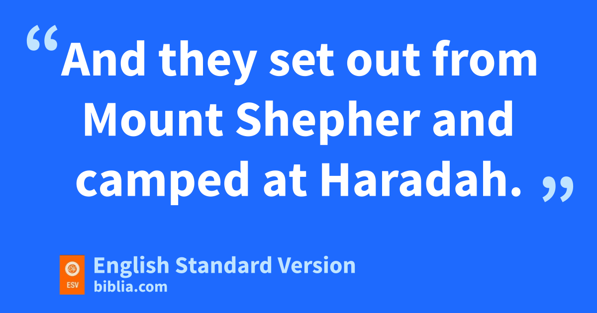 5 So the people of Israel set out from Rameses and camped at rSuccoth. 6 And they set out from Succoth and camped at sEtham, which is on the edge of the wilderness. 7 And they set out from Etham and turned back to tPi-hahiroth, which is east of Baal-zephon, and they camped before Migdol. 8 And they set out from before Hahiroth1 and upassed through the midst of the sea into the wilderness, and they vwent a three days’ journey in the wilderness of Etham and camped at Marah. 9 And they set out from Marah and came to wElim; at Elim there were twelve springs of water and seventy palm trees, and they camped there. 10 And they set out from Elim and camped by the Red Sea. 11 And they set out from the Red Sea and camped in xthe wilderness of Sin. 12 And they set out from the wilderness of Sin and camped at Dophkah. 13 And they set out from Dophkah and camped at Alush. 14 And they set out from Alush and camped at yRephidim, where there was no water for the people to drink. 15 And they set out from Rephidim and camped in the zwilderness of Sinai. 16 And they set out from the wilderness of Sinai and camped at aKibroth-hattaavah. 17 And they set out from Kibroth-hattaavah and camped at bHazeroth. 18 And they cset out from Hazeroth and camped at Rithmah. 19 And they set out from Rithmah and camped at Rimmon-perez. 20 And they set out from Rimmon-perez and camped at Libnah. 21 And they set out from Libnah and camped at Rissah. 22 And they set out from Rissah and camped at Kehelathah. 23 And they set out from Kehelathah and camped at Mount Shepher. 24 And they set out from Mount Shepher and camped at Haradah. 25 And they set out from Haradah and camped at Makheloth. 26 And they set out from Makheloth and camped at Tahath. 27 And they set out from Tahath and camped at Terah. 28 And they set out from Terah and camped at Mithkah. 29 And they set out from Mithkah and camped at Hashmonah. 30 And they set out from Hashmonah and camped at Moseroth. 31 And they set out from Moseroth and camped at dBene-jaakan. 32 And they set out from Bene-jaakan and camped at eHor-haggidgad. 33 And they set out from Hor-haggidgad and camped at eJotbathah. 34 And they set out from Jotbathah and camped at Abronah. 35 And they set out from Abronah and camped at fEzion-geber. 36 And they set out from Ezion-geber and camped in the gwilderness of Zin (that is, Kadesh). 37 And they set out from hKadesh and camped at iMount Hor, on the edge of the land of Edom.