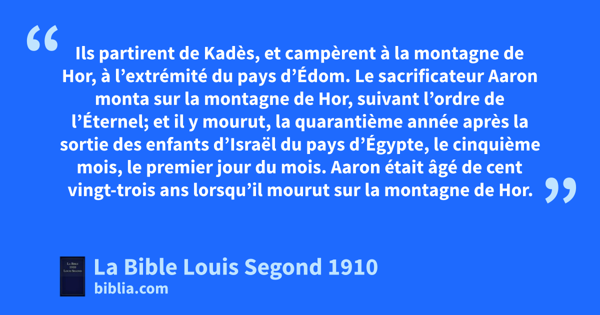 37Ils partirent de Kadès, et lcampèrent à la montagne de Hor, à l’extrémité du pays d’Édom. 38mLe sacrificateur Aaron monta sur la montagne de Hor, suivant l’ordre de l’Éternel; et il y mourut, la quarantième année après la sortie des enfants d’Israël du pays d’Égypte, le cinquième mois, le premier jour du mois. 39Aaron était âgé de cent vingt-trois ans lorsqu’il mourut sur la montagne de Hor. 40nLe roi d’Arad, Cananéen, qui habitait le midi du pays de Canaan, apprit l’arrivée des enfants d’Israël. 41Ils opartirent de la montagne de Hor, et campèrent à Tsalmona. 42Ils partirent de Tsalmona, et campèrent à Punon. 43Ils partirent de Punon, et pcampèrent à Oboth. 44Ils partirent d’Oboth, et campèrent à Ijjé-Abarim, sur la frontière de Moab. 45Ils partirent d’Ijjé-Abarim, et campèrent à Dibon-Gad. 46Ils partirent de Dibon-Gad, et campèrent à Almon-Diblathaïm. 47Ils partirent d’Almon-Diblathaïm, et campèrent aux montagnes d’Abarim, devant Nebo. 48Ils partirent des montagnes d’Abarim, et campèrent dans les plaines de Moab, près du Jourdain, vis-à-vis de Jéricho. 49Ils campèrent près du Jourdain, depuis Beth-Jeschimoth jusqu’à qAbel-Sittim, dans les plaines de Moab.