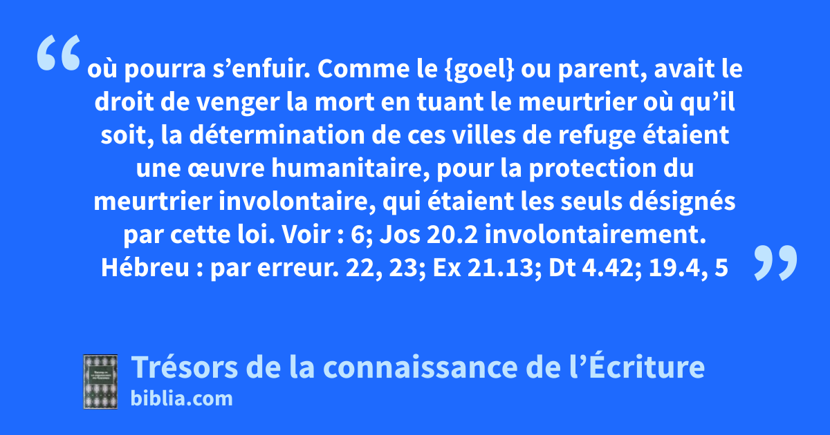 où pourra s’enfuir. Comme le {goel} ou parent, avait le droit de venger la mort en tuant le meurtrier où qu’il soit, la détermination de ces villes de refuge étaient une œuvre humanitaire, pour la protection du meurtrier involontaire, qui étaient les seuls désignés par cette loi. Voir : 6; Jos 20.2 involontairement. Hébreu : par erreur. 22, 23; Ex 21.13; Dt 4.42; 19.4, 5