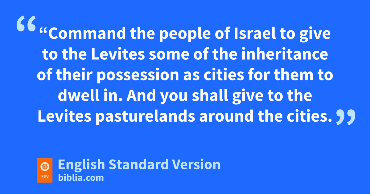 35 The Lord spoke to Moses in sthe plains of Moab by the Jordan at Jericho, saying, 2 t“Command the people of Israel to give to the Levites some of the inheritance of their possession as cities for them to dwell in. And you shall give to the Levites pasturelands around the cities. 3 The cities shall be theirs to dwell in, and their pasturelands shall be for their cattle and for their livestock and for all their beasts. 4 The pasturelands of the cities, which you shall give to the Levites, shall reach from the wall of the city outward a thousand cubits1 all around. 5 And you shall measure, outside the city, on the east side two thousand cubits, and on the south side two thousand cubits, and on the west side two thousand cubits, and on the north side two thousand cubits, the city being in the middle. This shall belong to them as pastureland for their cities.
