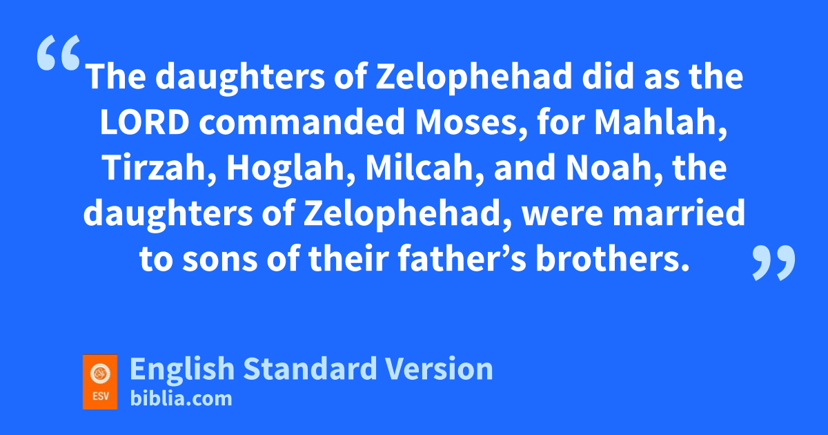 10 The daughters of Zelophehad did as the Lord commanded Moses, 11 yfor Mahlah, Tirzah, Hoglah, Milcah, and Noah, the daughters of Zelophehad, were married to sons of their father’s brothers. 12 They were married into the clans of the people of Manasseh the son of Joseph, and their inheritance remained in the tribe of their father’s clan.