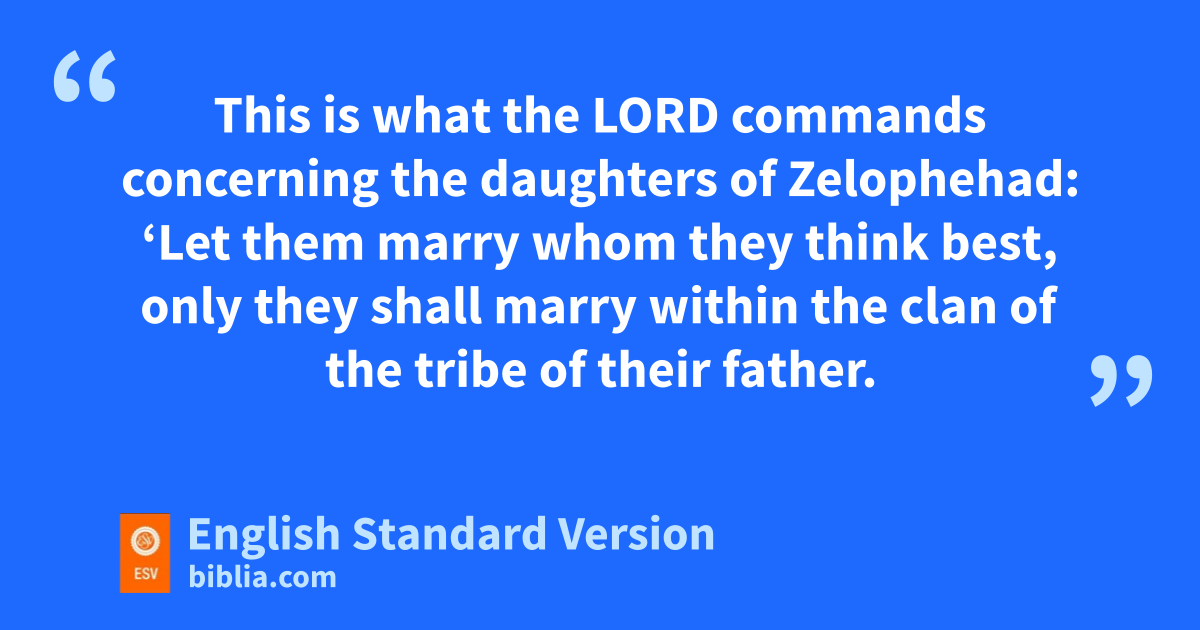 5 And Moses commanded the people of Israel according to the word of the Lord, saying, “The tribe of the people of Joseph uis right. 6 This is what the Lord commands concerning the daughters of Zelophehad: ‘Let them marry whom they think best, vonly they shall marry within the clan of the tribe of their father. 7 The inheritance of the people of Israel shall not be transferred from one tribe to another, for every one of the people of Israel wshall hold on to the inheritance of the tribe of his fathers. 8 And xevery daughter who possesses an inheritance in any tribe of the people of Israel shall be wife to one of the clan of the tribe of her father, so that every one of the people of Israel may possess the inheritance of his fathers. 9 So no inheritance shall be transferred from one tribe to another, for each of the tribes of the people of Israel shall hold on to its own inheritance.’ ”
