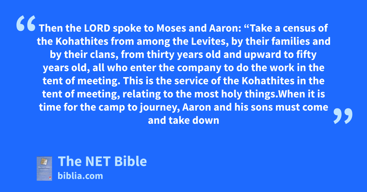 4:1 1 Then the Lord spoke to Moses and Aaron: 4:2 “Take a census2 of the Kohathites from among the Levites, by their families and by their clans, 4:3 from thirty years old and upward to fifty years old, all who enter the company3 to do the work in the tent of meeting. 4:4 This is the service of the Kohathites in the tent of meeting, relating to the most holy things.4 4:5 When it is time for the camp to journey,5 Aaron and his sons must come and take down the screening curtain and cover the ark of the testimony with it. 4:6 Then they must put over it a covering of fine leather6 and spread over that a cloth entirely of blue, and then they must insert its poles.