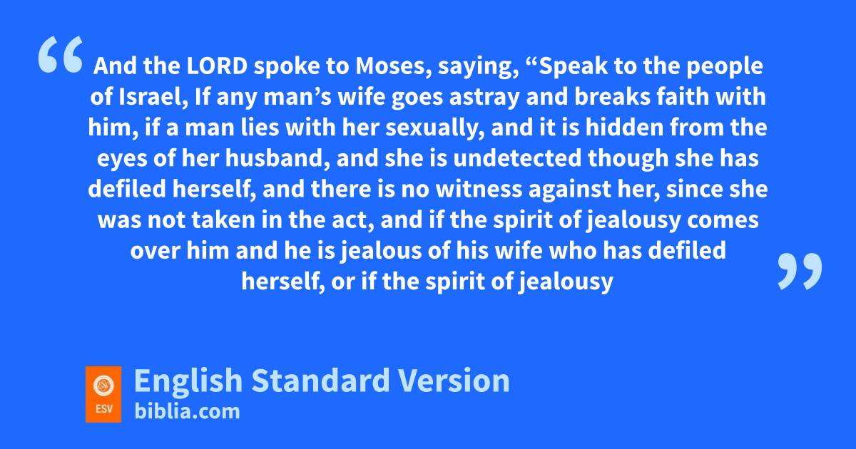 11 And the Lord spoke to Moses, saying, 12 “Speak to the people of Israel, If any man’s wife goes astray and breaks faith with him, 13 if a man rlies with her sexually, and it is hidden from the eyes of her husband, and she is undetected though she has defiled herself, and there is no witness against her, ssince she was not taken in the act, 14 and if the spirit of jealousy comes over him and he is jealous of his wife who has defiled herself, or if the spirit of jealousy comes over him and he is jealous of his wife, though she has not defiled herself, 15 then the man shall bring his wife to the priest and bring the offering required of her, a tenth of an ephah3 of barley flour. tHe shall pour no oil on it and put no frankincense on it, for it is a grain offering of jealousy, a grain offering of remembrance, ubringing iniquity to remembrance.