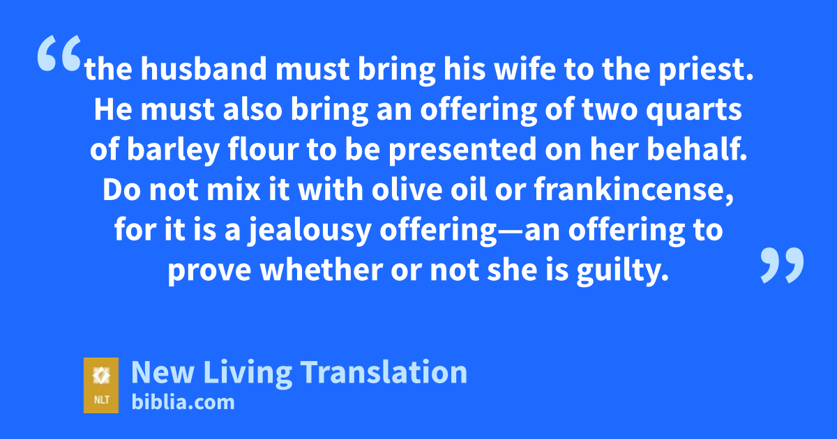 “Suppose a man’s wife goes astray, and she is unfaithful to her husband 13 and has sex with another man, but neither her husband nor anyone else knows about it. She has defiled herself, even though there was no witness and she was not caught in the act. 14 If her husband becomes jealous and is suspicious of his wife and needs to know whether or not she has defiled herself, 15 the husband must bring his wife to the priest. He must also bring an offering of two quarts* of barley flour to be presented on her behalf. Do not mix it with olive oil or frankincense, for it is a jealousy offering—an offering to prove whether or not she is guilty.