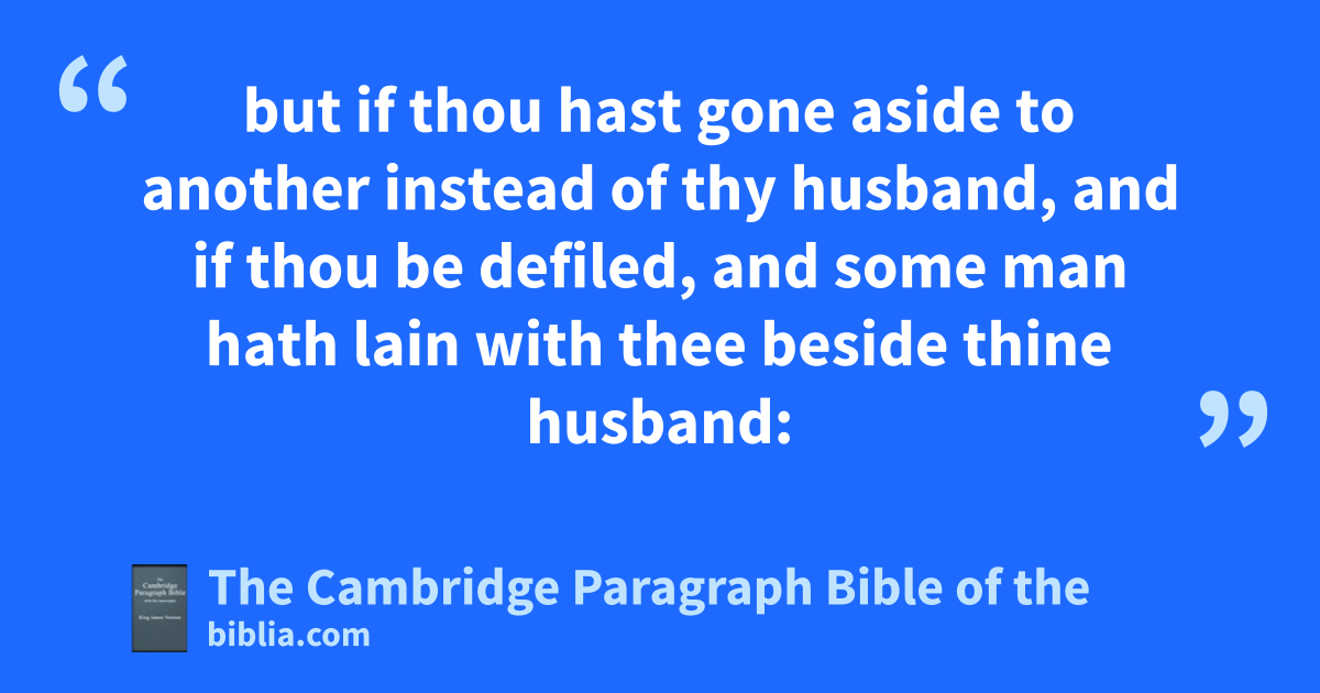 11 And the Lord spake unto Moses, saying, 12 Speak unto the children of Israel, and say unto them, If any man’s wife go aside, and commit a trespass against him, 13 and a man lie with her carnally, and it be hid from the eyes of her husband, and be kept close, and she be defiled, and there be no witness against her, neither mshe be taken with the manner; 14 and the spirit of jealousy come upon him, and he be jealous of his wife, and she be defiled: or if the spirit of jealousy come upon him, and he be jealous of his wife, and she be not defiled: 15 then shall the man bring his wife unto the priest, and he shall bring her offering for her, the tenth part of an ephah of barley meal; nhe shall pour no oil upon it, nor put frankincense thereon; for it is an offering of jealousy, an offering of memorial, obringing iniquity to remembrance. 16 And the priest shall bring her near, and set her before the Lord: 17 and the priest shall take holy water in an earthen vessel; and of the dust that is in the floor of the tabernacle the priest shall take, and put it into the water: 18 and the priest shall set the woman before the Lord, and uncover the woman’s head, and put the offering of memorial in her hands, which is the jealousy offering: and the priest shall have in his hand the bitter water that causeth the curse: 19 and the priest shall charge her by an oath, and say unto the woman, If no man have lain with thee, and if thou hast not gone aside to uncleanness * with another instead of thy husband, be thou free from this bitter water that causeth the curse: 20 but if thou hast gone aside to another instead of thy husband, and if thou be defiled, and some man hath lain with thee beside thine husband: 21 then the priest shall pcharge the woman with an oath of cursing, and the priest shall say unto the woman, qThe Lord make thee a curse and an oath among thy people, when the Lord doth make thy thigh to * rot, and thy belly to swell; 22 and this water that causeth the curse rshall go into thy bowels, to make thy belly to swell, and thy thigh to rot: And the woman shall say, sAmen, amen. 23 And the priest shall write these curses in a book, and he shall blot them out with the bitter water: 24 and he shall cause the woman to drink the bitter water that causeth the curse: and the water that causeth the curse shall enter into her, and become bitter. 25 Then the priest shall take the jealousy offering out of the woman’s hand, and shall twave the offering before the Lord, and offer it upon the altar: 26 and the priest ushall take a handful of the offering, even the memorial thereof, and burn it upon the altar, and afterward shall cause the woman to drink the water. 27 And when he hath made her to drink the water, then it shall come to pass, that if she be defiled, and have done trespass against her husband, that the water that causeth the curse shall enter into her, and become bitter, and her belly shall swell, and her thigh shall rot: and the woman xshall be a curse among her people. 28 And if the woman be not defiled, but be clean; then she shall be free, and shall conceive seed. 29 This is the law of jealousies, when a wife goeth aside to another yinstead of her husband, and is defiled; 30 or when the spirit of jealousy cometh upon him, and he be jealous over his wife, and shall set the woman before the Lord, and the priest shall execute upon her all this law. 31 Then shall the man be guiltless from iniquity, and this woman zshall bear her iniquity.