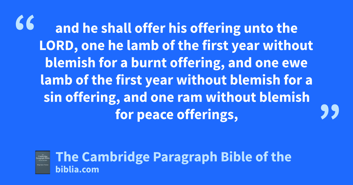 VI. And the Lord spake unto Moses, saying, 2 Speak unto the children of Israel, and say unto them, When either man or woman shall aseparate themselves to vow a vow of ba Nazarite, * to separate themselves unto the Lord: 3 he shall separate himself from cwine and strong drink, and shall drink no vinegar of wine, or vinegar of strong drink, neither shall he drink any liquor of grapes, nor eat moist grapes, or dried. 4 All the days of his * separation shall he eat nothing that is made of the * vine tree, from the kernels even to the husk. 5 All the days of the vow of his separation there shall no drasor come upon his head: until the days be fulfilled, in the which he separateth himself unto the Lord, he shall be holy, and shall let ethe locks of the hair of his head grow. 6 All the days that he separateth himself unto the Lord fhe shall come at no dead body. 7 gHe shall not make himself unclean for his father, or for his mother, for his brother, or for his sister, when they die: because the * consecration of his God is upon his head. 8 All the days of his separation he is holy unto the Lord. 9 And if any man die hvery suddenly by him, and he hath defiled the head of his consecration; then he shall ishave his head in the day of his cleansing, on the seventh day shall he shave it. 10 And kon the eighth day he shall bring two turtles, or two young pigeons, to the priest, to the door of the tabernacle of the congregation: 11 and the priest shall offer the one for a sin offering, and the other for a burnt offering, and make an atonement for him, for that he sinned by the dead, and shall hallow his head that same day. 12 And he shall consecrate unto the Lord the days of his separation, and shall bring a lamb of the first year lfor a trespass offering: but the days that were before shall * be lost, because his separation was defiled. 13 And this is the law of the Nazarite, mwhen the days of his separation are fulfilled: he shall be brought unto the door of the tabernacle of the congregation: 14 and he shall offer his offering unto the Lord, one he lamb of the first year without blemish for a burnt offering, and one ewe lamb of the first year without blemish nfor a sin offering, and one ram without blemish ofor peace offerings, 15 and a basket of unleavened bread, pcakes of fine flour mingled with oil, and wafers of unleavened bread qanointed with oil, and their meat offering, and their rdrink offerings. 16 And the priest shall bring them before the Lord, and shall offer shis sin offering, and shis burnt offering: 17 and he shall offer sthe ram for a sacrifice of peace offerings unto the Lord, with the basket of unleavened bread: the priest shall offer also this meat offering, and his drink offering. 18 And the Nazarite ushall shave the head of his separation at the door of the tabernacle of the congregation, and shall take the hair of the head of his separation, and put it in the fire which is under the sacrifice of the peace offerings. 19 And the priest shall take the xsodden shoulder of the ram, and one unleavened cake out of the basket, and one unleavened wafer, and yshall put them upon the hands of the Nazarite, after the hair of his separation is shaven: 20 and the priest shall zwave them for a wave offering before the Lord: athis is holy for the priest, with the wave breast and heave shoulder: and after that the Nazarite may drink wine. 21 This is the law of the Nazarite who hath vowed, and of his offering unto the Lord for his separation, besides that bthat his hand shall get: according to the vow which he vowed, so he must do after the law of his separation.