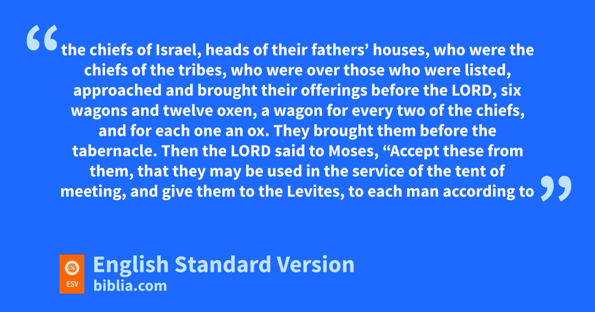 7 On the day when Moses had finished fsetting up the tabernacle and had anointed and gconsecrated it with all its furnishings and had anointed and consecrated the altar with all its utensils, 2 hthe chiefs of Israel, heads of their fathers’ houses, who were the chiefs of the tribes, who were over those who were listed, approached 3 and brought their offerings before the Lord, six wagons and twelve oxen, a wagon for every two of the chiefs, and for each one an ox. They brought them before the tabernacle. 4 Then the Lord said to Moses, 5 “Accept these from them, that they may be used in the service of the tent of meeting, and give them to the Levites, to each man according to his service.” 6 So Moses took the wagons and the oxen and gave them to the Levites. 7 Two wagons and four oxen ihe gave to the sons of Gershon, according to their service. 8 And four wagons and eight oxen jhe gave to the sons of Merari, according to their service, under the direction of Ithamar the son of Aaron the priest. 9 But to the sons of Kohath he gave none, because they were charged with kthe service of the holy things that lhad to be carried on the shoulder. 10 And the chiefs offered offerings for the mdedication of the altar on the day it was anointed; and the chiefs offered their offering before the altar. 11 And the Lord said to Moses, “They shall offer their offerings, one chief each day, for the dedication of the altar.”