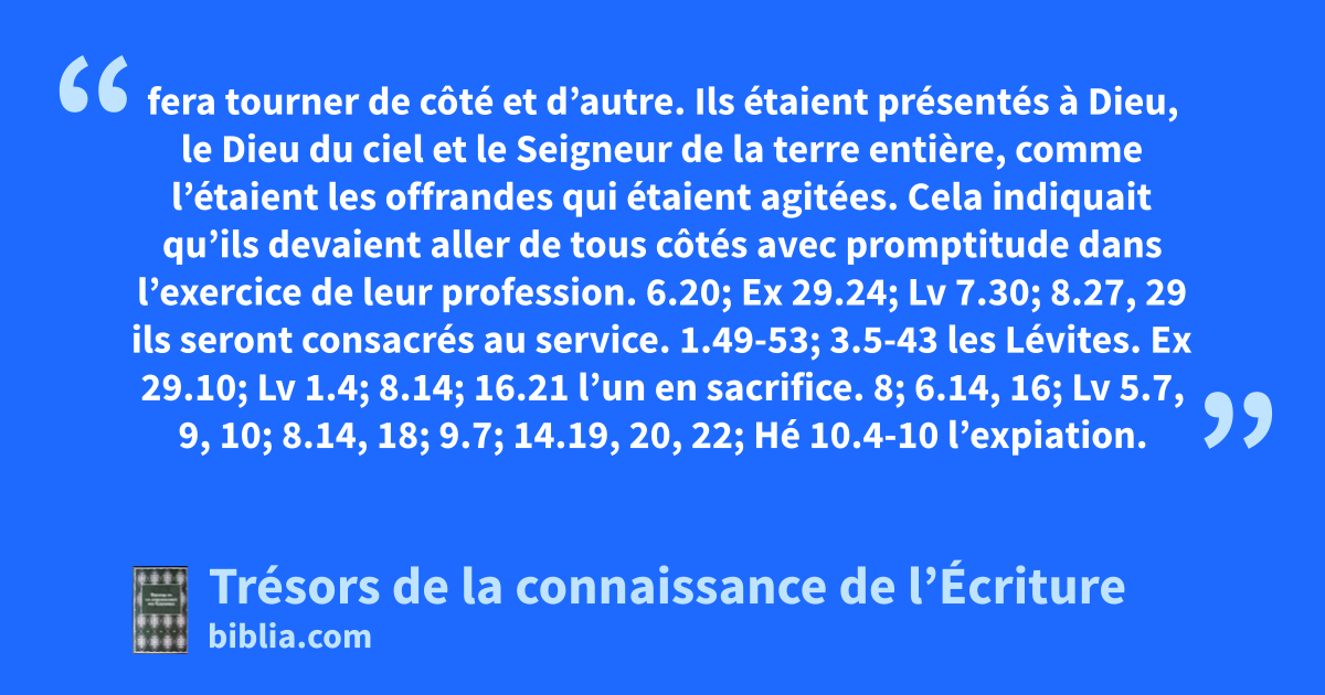 fera tourner de côté et d’autre. Ils étaient présentés à Dieu, le Dieu du ciel et le Seigneur de la terre entière, comme l’étaient les offrandes qui étaient agitées. Cela indiquait qu’ils devaient aller de tous côtés avec promptitude dans l’exercice de leur profession. 6.20; Ex 29.24; Lv 7.30; 8.27, 29 ils seront consacrés au service. 1.49-53; 3.5-43