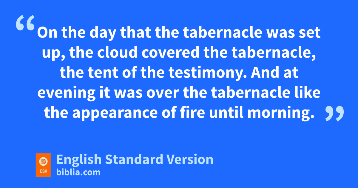15 rOn the day that the tabernacle was set up, the cloud covered the tabernacle, the tent of the testimony. And sat evening it was over the tabernacle like the appearance of fire until morning. 16 So it was always: the cloud covered it by day1 and the appearance of fire by night. 17 And whenever the cloud tlifted from over the tent, after that the people of Israel set out, and in the place where the cloud settled down, there the people of Israel camped. 18 At the command of the Lord the people of Israel set out, and at the command of the Lord they camped. uAs long as the cloud rested over the tabernacle, they remained in camp. 19 Even when the cloud continued over the tabernacle many days, the people of Israel vkept the charge of the Lord and did not set out. 20 Sometimes the cloud was a few days over the tabernacle, and according to the command of the Lord they remained in camp; then according to the command of the Lord they set out. 21 And sometimes the cloud remained from evening until morning. And when the cloud lifted in the morning, they set out, or if it continued for a day and a night, when the cloud lifted they set out. 22 Whether it was two days, or a month, or a longer time, that the cloud continued over the tabernacle, abiding there, the people of Israel wremained in camp and did not set out, but when it lifted they set out. 23 At the command of the Lord they camped, and at the command of the Lord they set out. vThey kept the charge of the Lord, at the command of the Lord by Moses.