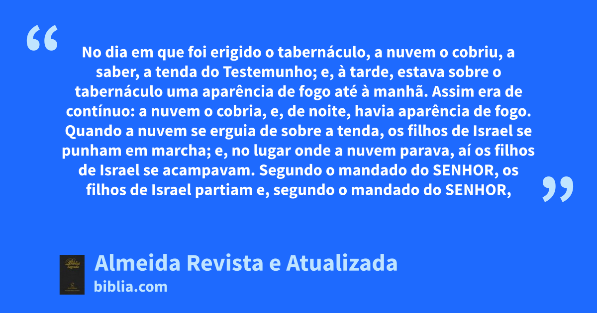 15 No dia em que foi erigido o tabernáculo, a nuvem o cobriu, a saber, a tenda do Testemunho; e, à tarde, estava sobre o tabernáculo uma aparência de fogo até à manhã. 16 Assim era de contínuo: a nuvem o cobria, e, de noite, havia aparência de fogo. 17 Quando a nuvem se erguia de sobre a tenda, os filhos de Israel se punham em marcha; e, no lugar onde a nuvem parava, aí os filhos de Israel se acampavam. 18 Segundo o mandado do Senhor, os filhos de Israel partiam e, segundo o mandado do Senhor, se acampavam; por todo o tempo em que a nuvem pairava sobre o tabernáculo, permaneciam acampados. 19 Quando a nuvem se detinha muitos dias sobre o tabernáculo, então, os filhos de Israel cumpriam a ordem do Senhor e não partiam. 20 Às vezes, a nuvem ficava poucos dias sobre o tabernáculo; então, segundo o mandado do Senhor, permaneciam e, segundo a ordem do Senhor, partiam. 21 Às vezes, a nuvem ficava desde a tarde até à manhã; quando, pela manhã, a nuvem se erguia, punham-se em marcha; quer de dia, quer de noite, erguendo-se a nuvem, partiam. 22 Se a nuvem se detinha sobre o tabernáculo por dois dias, ou um mês, ou por mais tempo, enquanto pairava sobre ele, os filhos de Israel permaneciam acampados e não se punham em marcha; mas, erguendo-se ela, partiam. 23 Segundo o mandado do Senhor, se acampavam e, segundo o mandado do Senhor, se punham em marcha; cumpriam o seu dever para com o Senhor, segundo a ordem do Senhor por intermédio de Moisés.