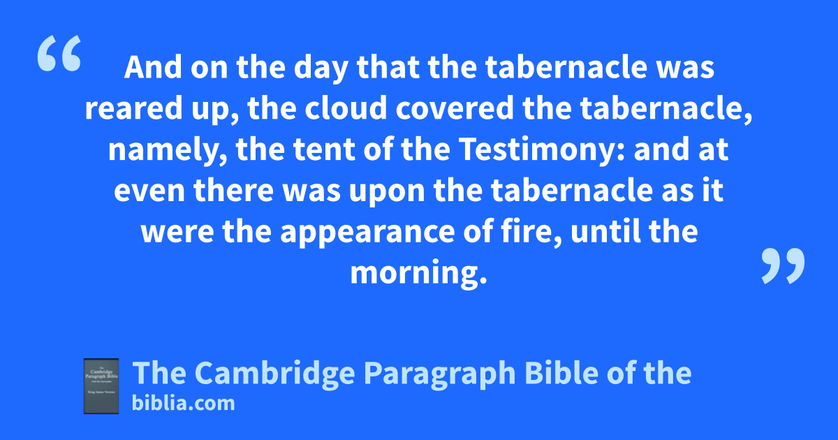 15 * And pon the day that the tabernacle was reared up, the cloud covered the tabernacle, namely, the tent of the Testimony: and qat even there was upon the tabernacle as it were the appearance of fire, until the morning. 16 So it was alway: the cloud covered it by day, and the appearance of fire by night. 17 And when the cloud rwas taken up from the tabernacle, then after that the children of Israel journeyed: and in the place where the cloud abode, there the children of Israel pitched their tents. 18 At the commandment of the Lord the children of Israel journeyed, and at the commandment of the Lord they pitched: sas long as the cloud abode upon the tabernacle they rested in the tents. 19 And when the cloud * tarried long upon the tabernacle many days, then the children of Israel tkept the charge of the Lord, and journeyed not. 20 And so it was, when the cloud was ua few days upon the tabernacle; according to the commandment of the Lord they abode in their tents, and according to the commandment of the Lord they journeyed. 21 And so it was, when the cloud * abode from even unto the morning, and that the cloud was taken up in the morning, then they journeyed: whether it was by day or by night that the cloud was taken up, they journeyed. 22 Or whether it were two days, or a month, xor a year, that the cloud tarried upon the tabernacle, remaining thereon, the children of Israel yabode in their tents, and journeyed not: but when it was taken up, they journeyed. 23 At the commandment of the Lord they rested in the tents, and at the commandment of the Lord they journeyed: they zkept the charge of the Lord, at the commandment of the Lord by the hand of Moses.