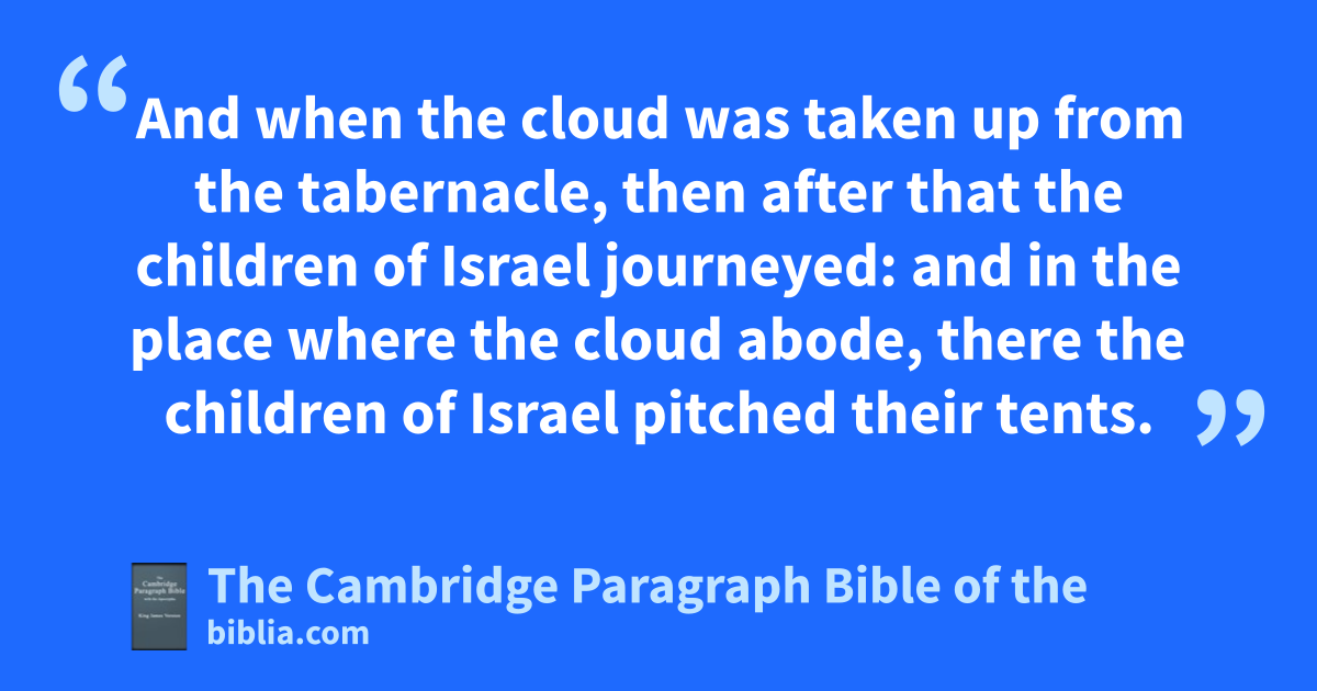 15 * And pon the day that the tabernacle was reared up, the cloud covered the tabernacle, namely, the tent of the Testimony: and qat even there was upon the tabernacle as it were the appearance of fire, until the morning. 16 So it was alway: the cloud covered it by day, and the appearance of fire by night. 17 And when the cloud rwas taken up from the tabernacle, then after that the children of Israel journeyed: and in the place where the cloud abode, there the children of Israel pitched their tents. 18 At the commandment of the Lord the children of Israel journeyed, and at the commandment of the Lord they pitched: sas long as the cloud abode upon the tabernacle they rested in the tents. 19 And when the cloud * tarried long upon the tabernacle many days, then the children of Israel tkept the charge of the Lord, and journeyed not. 20 And so it was, when the cloud was ua few days upon the tabernacle; according to the commandment of the Lord they abode in their tents, and according to the commandment of the Lord they journeyed. 21 And so it was, when the cloud * abode from even unto the morning, and that the cloud was taken up in the morning, then they journeyed: whether it was by day or by night that the cloud was taken up, they journeyed. 22 Or whether it were two days, or a month, xor a year, that the cloud tarried upon the tabernacle, remaining thereon, the children of Israel yabode in their tents, and journeyed not: but when it was taken up, they journeyed. 23 At the commandment of the Lord they rested in the tents, and at the commandment of the Lord they journeyed: they zkept the charge of the Lord, at the commandment of the Lord by the hand of Moses.