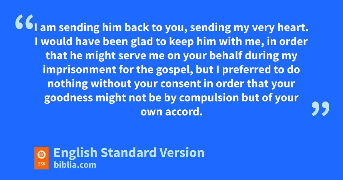 8 Accordingly, mthough I am bold enough in Christ to command you to do nwhat is required, 9 yet for love’s sake I prefer to appeal to you—I, Paul, an old man and now oa prisoner also for Christ Jesus— 10 I appeal to you for pmy child, qOnesimus,2 rwhose father I became in my imprisonment. 11 (Formerly he was useless to you, but now he is indeed useful to you and to me.) 12 I am sending him back to you, sending my very heart. 13 I would have been glad to keep him with me, in order that he might serve me son your behalf tduring my imprisonment for the gospel, 14 but I preferred to do nothing without your consent in order that your goodness might not be uby compulsion but of your own accord. 15 For this perhaps is why vhe was parted from you for a while, that you might have him back forever, 16 wno longer as a bondservant3 but more than a bondservant, as xa beloved brother—especially to me, but how much more to you, yboth in the flesh and in the Lord.