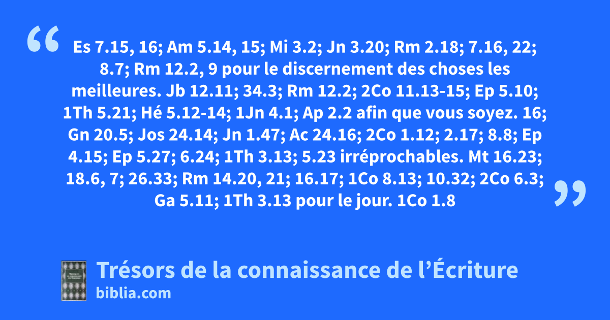 Es 7.15, 16; Am 5.14, 15; Mi 3.2; Jn 3.20; Rm 2.18; 7.16, 22; 8.7; Rm 12.2, 9 pour le discernement des choses les meilleures. Jb 12.11; 34.3; Rm 12.2; 2Co 11.13-15; Ep 5.10; 1Th 5.21; Hé 5.12-14; 1Jn 4.1; Ap 2.2 afin que vous soyez. 16; Gn 20.5; Jos 24.14; Jn 1.47; Ac 24.16; 2Co 1.12; 2.17; 8.8; Ep 4.15; Ep 5.27; 6.24; 1Th 3.13; 5.23 irréprochables. Mt 16.23; 18.6, 7; 26.33; Rm 14.20, 21; 16.17; 1Co 8.13; 10.32; 2Co 6.3; Ga 5.11; 1Th 3.13 pour le jour. 1Co 1.8