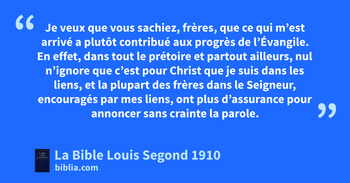 12Je veux que vous sachiez, frères, que ce qui m’est arrivé a plutôt contribué aux progrès de l’Évangile. 13En effet, dans tout le prétoire et partout ailleurs, nul n’ignore que c’est pour Christ que je suis dans les liens, 14fet la plupart des frères dans le Seigneur, encouragés par mes liens, ont plus d’assurance pour annoncer sans crainte la parole. 15Quelques-uns, il est vrai, prêchent Christ par envie et par esprit de dispute; mais d’autres le prêchent avec des dispositions bienveillantes. 16Ceux-ci agissent par amour, sachant que je suis établi pour la défense de l’Évangile, 17tandis que ceux-là, animés d’un esprit de dispute, annoncent Christ par des motifs qui ne sont pas purs et avec la pensée de me susciter quelque tribulation dans mes liens. 18Qu’importe? De toute manière, que ce soit pour l’apparence, que ce soit sincèrement, Christ n’est pas moins annoncé: je m’en réjouis, et je m’en réjouirai encore. 19gCar je sais que cela tournera à mon salut, grâce à vos prières et à l’assistance de l’Esprit de Jésus-Christ, 20selon ma ferme attente et mon espérance hque je n’aurai honte de rien, mais que, maintenant comme toujours, Christ sera glorifié dans mon corps avec une pleine assurance, soit par ma vie, soit par ma mort; 21car Christ est ma vie, et la mort m’est un gain. 22Mais s’il est utile pour mon oeuvre que je vive dans la chair, je ne saurais dire ce que je dois préférer. 23Je suis pressé des deux côtés: j’ai le désir de m’en aller et d’être avec Christ, ce qui de beaucoup est le meilleur; 24mais à cause de vous il est plus nécessaire que je demeure dans la chair. 25Et je suis persuadé, je sais que je demeurerai et que je resterai avec vous tous, pour votre avancement et pour votre joie dans la foi, 26afin que, par mon retour auprès de vous, vous ayez en moi un abondant sujet de vous glorifier en Jésus-Christ.