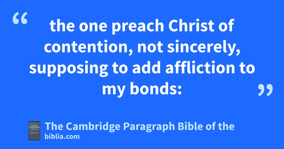 12 But I would ye should understand, brethren, that the things which happened unto me have fallen out rather unto the hfurtherance of the gospel; 13 so that imy bonds * in Christ kare manifest in all * the palace, and * in all other places; 14 and many of the brethren in the Lord, waxing confident by imy bonds, are much more bold to speak the word without fear. 15 Some indeed preach Christ leven of envy and strife; and some also of good will: 16 the one preach Christ mof contention, not sincerely, supposing to add affliction to imy bonds: 17 but the other of love, nknowing that oI am set for pthe defence of the gospel. 18 What then? notwithstanding, every way, whether in pretence, or in truth, Christ is preached; and I therein do rejoice, yea, and will rejoice. 19 For I know that this shall turn to my salvation qthrough your prayer, and the supply of rthe Spirit of Jesus Christ, 20 according to my searnest expectation and my hope, that tin nothing I shall be ashamed, but that uwith all boldness, as always, so now also Christ shall be magnified in my body, whether it be by life, or by death. 21 For to me wto live is Christ, and to die is gain. 22 But if I live in the flesh, this is the fruit of my labour: yet what I shall choose I wot not. 23 For xI am in a strait betwixt two, yhaving a desire zto depart, and to be with Christ; which is far better: 24 nevertheless to abide in the flesh is more needful for you. 25 And ahaving this confidence, I know that I shall babide and continue with you all for your cfurtherance and joy of faith; 26 that dyour rejoicing may be more abundant in Jesus Christ for me by my coming to you again.