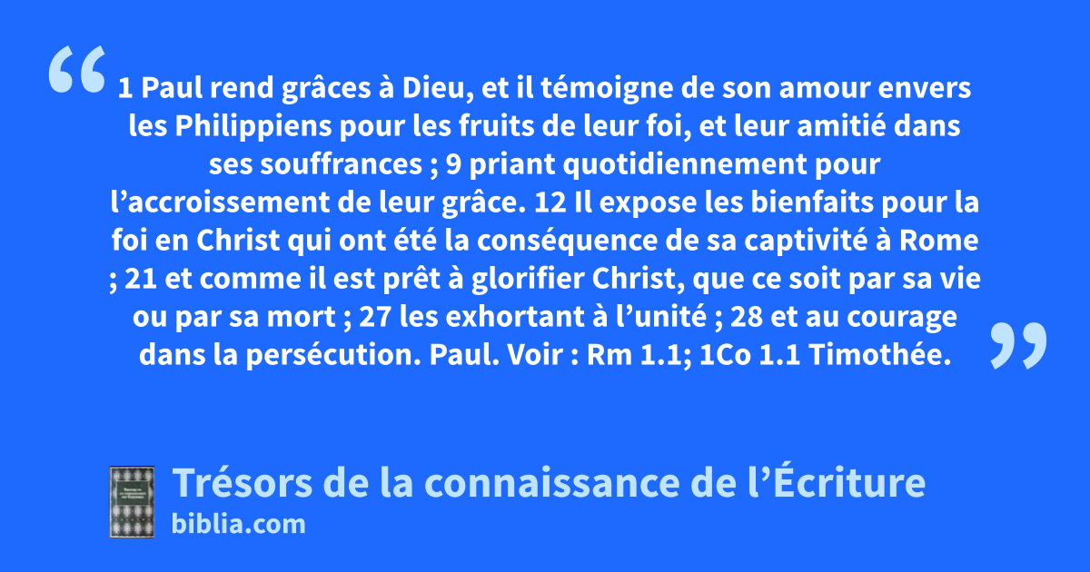 Paul. Voir : Rm 1.1; 1Co 1.1 Timothée. Ac 16.1-3; 1Co 16.10; 2Co 1.1; Col 1.1; 1Th 1.1; 2Th 1.1; 1Tm 1.2; Hé 13.23 serviteurs. Mc 13.34; Jn 12.26; Tt 1.1; Jc 1.1; 2P 1.1; Jd 1; Ap 1.1; 19.10; 22.9 à tous les saints. Rm 1.7; 1Co 1.2; 2Co 1.1; Ep 1.1, 15; 2Th 1.10 à Philippes. Ac 16.12 etc. 1Th 2.2 aux évêques. Ac 1.20; 1Tm 3.1, 2; Tt 1.7; 1P 2.25; Ap 1.20; 2.1, 8, 12 et aux diacres. Ac 6.1-7; 1Tm 3.8, 10, 12, 13