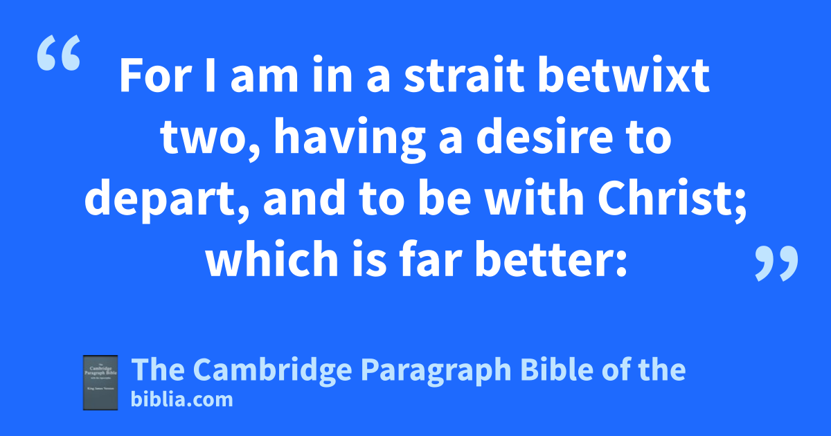 12 But I would ye should understand, brethren, that the things which happened unto me have fallen out rather unto the hfurtherance of the gospel; 13 so that imy bonds * in Christ kare manifest in all * the palace, and * in all other places; 14 and many of the brethren in the Lord, waxing confident by imy bonds, are much more bold to speak the word without fear. 15 Some indeed preach Christ leven of envy and strife; and some also of good will: 16 the one preach Christ mof contention, not sincerely, supposing to add affliction to imy bonds: 17 but the other of love, nknowing that oI am set for pthe defence of the gospel. 18 What then? notwithstanding, every way, whether in pretence, or in truth, Christ is preached; and I therein do rejoice, yea, and will rejoice. 19 For I know that this shall turn to my salvation qthrough your prayer, and the supply of rthe Spirit of Jesus Christ, 20 according to my searnest expectation and my hope, that tin nothing I shall be ashamed, but that uwith all boldness, as always, so now also Christ shall be magnified in my body, whether it be by life, or by death. 21 For to me wto live is Christ, and to die is gain. 22 But if I live in the flesh, this is the fruit of my labour: yet what I shall choose I wot not. 23 For xI am in a strait betwixt two, yhaving a desire zto depart, and to be with Christ; which is far better: 24 nevertheless to abide in the flesh is more needful for you. 25 And ahaving this confidence, I know that I shall babide and continue with you all for your cfurtherance and joy of faith; 26 that dyour rejoicing may be more abundant in Jesus Christ for me by my coming to you again.