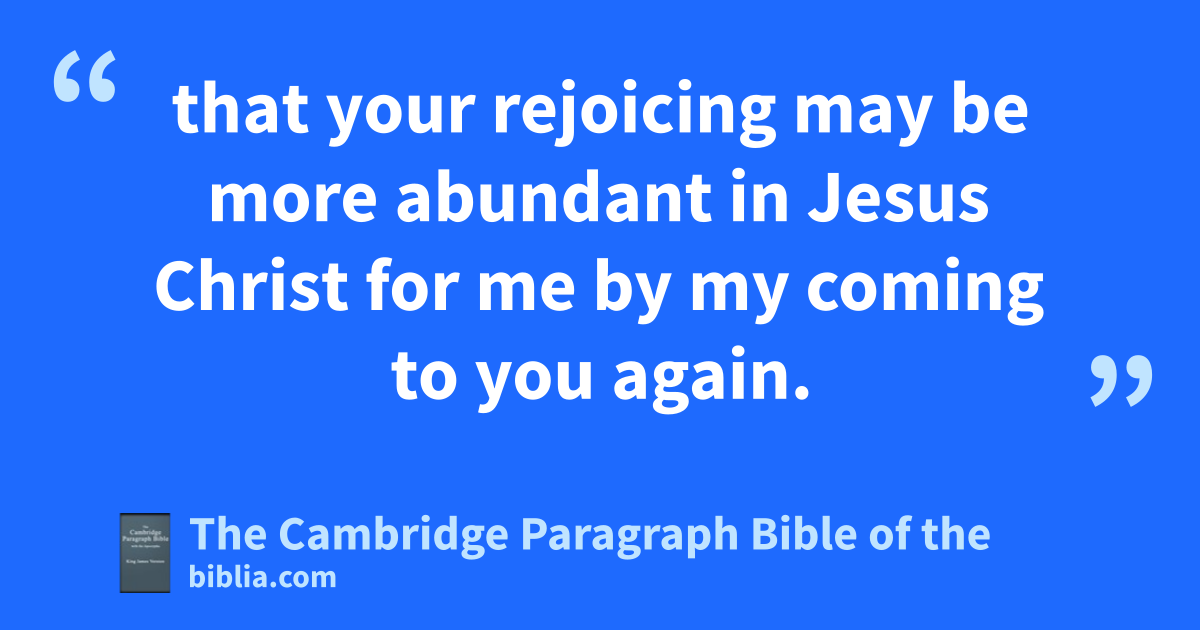 12 But I would ye should understand, brethren, that the things which happened unto me have fallen out rather unto the hfurtherance of the gospel; 13 so that imy bonds * in Christ kare manifest in all * the palace, and * in all other places; 14 and many of the brethren in the Lord, waxing confident by imy bonds, are much more bold to speak the word without fear. 15 Some indeed preach Christ leven of envy and strife; and some also of good will: 16 the one preach Christ mof contention, not sincerely, supposing to add affliction to imy bonds: 17 but the other of love, nknowing that oI am set for pthe defence of the gospel. 18 What then? notwithstanding, every way, whether in pretence, or in truth, Christ is preached; and I therein do rejoice, yea, and will rejoice. 19 For I know that this shall turn to my salvation qthrough your prayer, and the supply of rthe Spirit of Jesus Christ, 20 according to my searnest expectation and my hope, that tin nothing I shall be ashamed, but that uwith all boldness, as always, so now also Christ shall be magnified in my body, whether it be by life, or by death. 21 For to me wto live is Christ, and to die is gain. 22 But if I live in the flesh, this is the fruit of my labour: yet what I shall choose I wot not. 23 For xI am in a strait betwixt two, yhaving a desire zto depart, and to be with Christ; which is far better: 24 nevertheless to abide in the flesh is more needful for you. 25 And ahaving this confidence, I know that I shall babide and continue with you all for your cfurtherance and joy of faith; 26 that dyour rejoicing may be more abundant in Jesus Christ for me by my coming to you again.