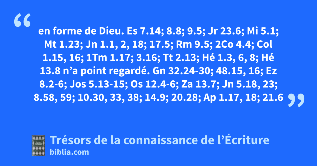 en forme de Dieu. Es 7.14; 8.8; 9.5; Jr 23.6; Mi 5.1; Mt 1.23; Jn 1.1, 2, 18; 17.5; Rm 9.5; 2Co 4.4; Col 1.15, 16; 1Tm 1.17; 3.16; Tt 2.13; Hé 1.3, 6, 8; Hé 13.8 n’a point regardé. Gn 32.24-30; 48.15, 16; Ez 8.2-6; Jos 5.13-15; Os 12.4-6; Za 13.7; Jn 5.18, 23; 8.58, 59; 10.30, 33, 38; 14.9; 20.28; Ap 1.17, 18; 21.6