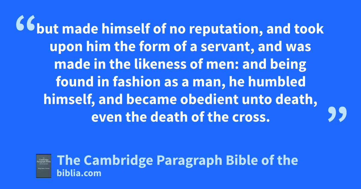II. If there be therefore any aconsolation in Christ, if any bcomfort of love, if cany fellowship dof the Spirit, if any ebowels and mercies, 2 ffulfil ye my joy, that gye be likeminded, having the same love, being of one accord, of one mind. 3 Let nothing be done through hstrife or ivainglory; but in jlowliness of mind let keach esteem other better than themselves. 4 Look not every man on his own things, but levery man also on the things of others. 5 mLet this mind be in you, which was also in Christ Jesus: 6 Who, nbeing in the oform of God, thought it not probbery to be qequal with God: 7 but rmade himself of no reputation, and took upon him the form of sa servant, and twas made in the likeness of men: 8 and being found in * ufashion as a man, rhe humbled himself, and wbecame obedient unto death, even xthe death of the cross. 9 yWherefore zGod also hath ahighly exalted him, and given him ba name which is above every name: 10 that at the name of Jesus cevery knee should bow, of dethings in heaven, and dethings in earth, and dfthings under the earth; 11 and ffthat every tongue should confess that Jesus gChrist is hLord, to the glory of God the Father. 12 Wherefore, my beloved, ias ye have always kobeyed, not as in my presence only, but now much more in my absence, lwork out your own salvation with mfear and trembling. 13 For nit is God which worketh in you both to will and to do of his ogood pleasure. 14 Do all things without pmurmurings and qdisputings: 15 that ye may be rblameless and * harmless, sthe sons of God twithout rebuke, uin the midst of a vcrooked and wperverse nation, among whom * ye shine xas lights in the world; 16 holding forth ythe word of life; that zI may rejoice in the day of Christ, that aI have not run in vain, neither aalaboured in vain. 17 Yea, and if I be * boffered upon the sacrifice and cservice of your faith, dI joy, and rejoice with you all. 18 For the same cause also do ye joy, and rejoice with me.