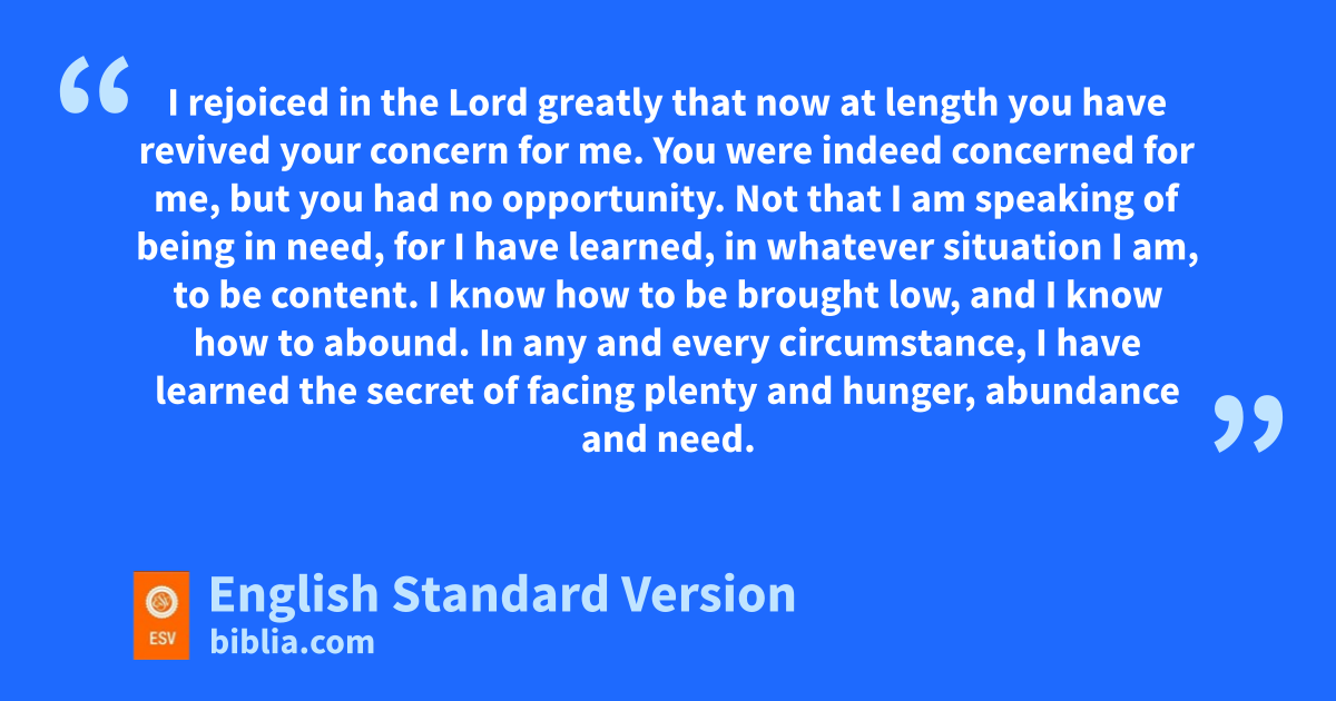 10 I rejoiced in the Lord greatly that now at length zyou have revived your concern for me. You were indeed concerned for me, but you had no opportunity. 11 Not that I am speaking of being in need, for I have learned, in whatever situation I am, to be acontent. 12 I know how to be brought low, and I know how to abound. In any and every circumstance, I have learned the secret of facing plenty and bhunger, abundance and cneed. 13 I can do all things dthrough him who strengthens me.