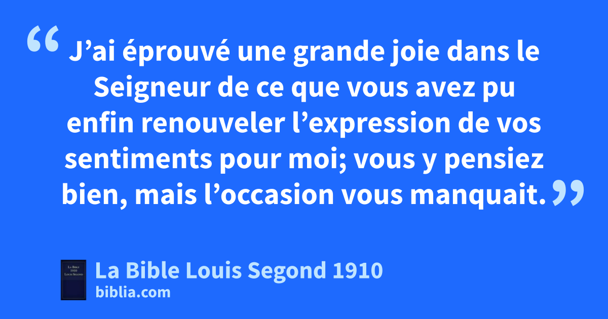 10J’ai éprouvé une grande joie dans le Seigneur de ce que vous avez pu enfin renouveler l’expression hde vos sentiments pour moi; vous y pensiez bien, mais l’occasion vous manquait. 11Ce n’est pas en vue de mes besoins que je dis cela, car j’ai appris ià être content de l’état où je me trouve. 12Je sais jvivre dans l’humiliation, et je sais vivre dans l’abondance. En tout et partout j’ai appris à être rassasié et à avoir faim, à être dans l’abondance et à être dans la disette. 13Je puis tout par celui qui me fortifie. 14Cependant vous avez bien fait de prendre part à ma détresse. 15kVous le savez vous-mêmes, Philippiens, au commencement de la prédication de l’Évangile, lorsque je partis de la Macédoine, aucune Église n’entra en compte avec moi pour ce qu’elle donnait et recevait; 16vous fûtes les seuls à le faire, car vous m’envoyâtes déjà à Thessalonique, et à deux reprises, de quoi pourvoir à mes besoins. 17Ce n’est pas que je recherche les dons; mais je recherche le fruit qui abonde pour votre compte. 18J’ai tout reçu, et je suis dans l’abondance; j’ai été comblé de biens, en recevant par Épaphrodite ce qui vient de vous lcomme un parfum de bonne odeur, un sacrifice que Dieu accepte, et qui lui est agréable. 19Et mon Dieu pourvoira à tous vos besoins selon sa richesse, avec gloire, en Jésus-Christ. 20A notre Dieu et Père soit la gloire aux siècles des siècles! Amen!