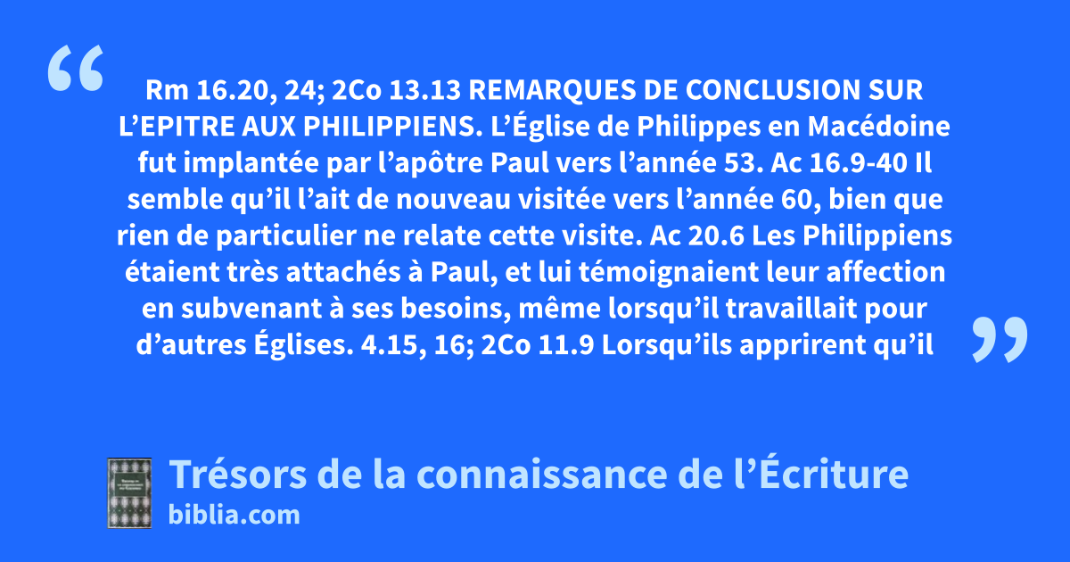 L’Église de Philippes en Macédoine fut implantée par l’apôtre Paul vers l’année 53. Ac 16.9-40 Il semble qu’il l’ait de nouveau visitée vers l’année 60, bien que rien de particulier ne relate cette visite. Ac 20.6 Les Philippiens étaient très attachés à Paul, et lui témoignaient leur affection en subvenant à ses besoins, même lorsqu’il travaillait pour d’autres Églises. 4.15, 16; 2Co 11.9 Lorsqu’ils apprirent qu’il était emprisonné à Rome, ils lui ont envoyé Épaphrodite, un de leurs pasteurs, avec quelques présents. 2.25; 4.10, 14-18 L’occasion de cette lettre fut le retour d’Épaphrodite, par lequel l’apôtre leur manifeste sa tendresse, et elle fut écrite vers la fin du premier emprisonnement, en fin 62, ou début 63.