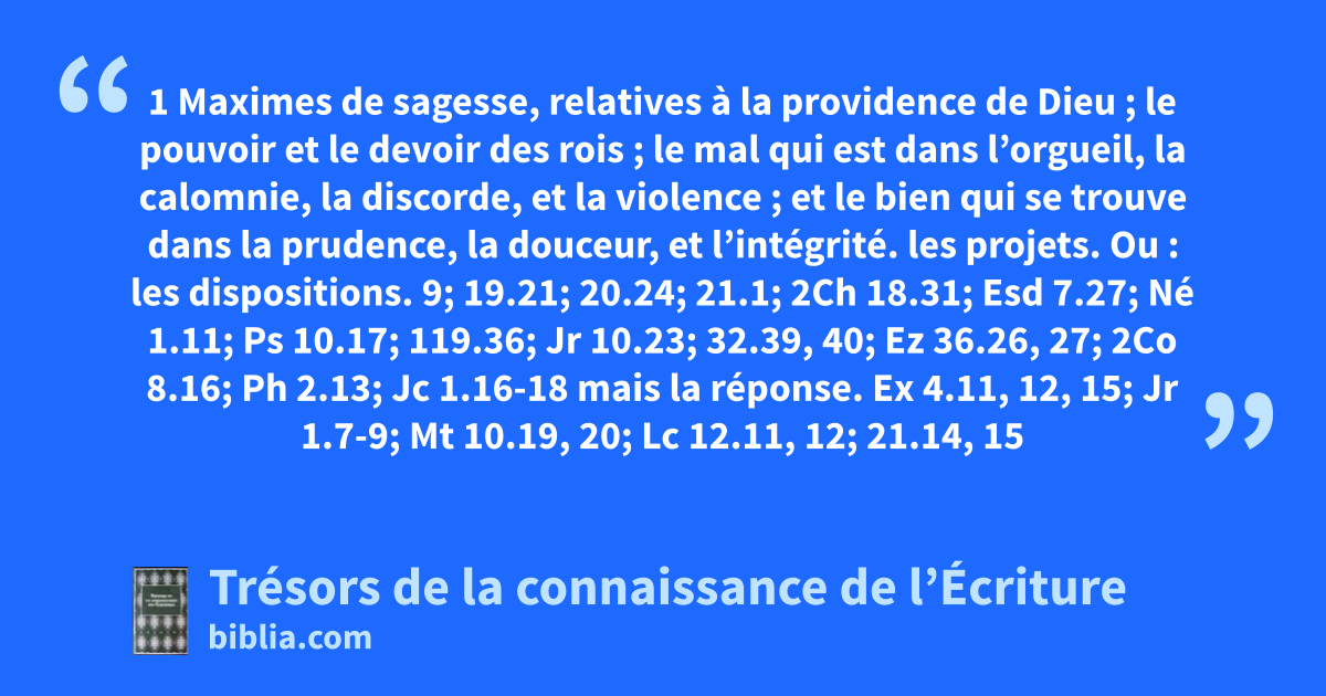 les projets. Ou : les dispositions. 9; 19.21; 20.24; 21.1; 2Ch 18.31; Esd 7.27; Né 1.11; Ps 10.17; 119.36; Jr 10.23; 32.39, 40; Ez 36.26, 27; 2Co 8.16; Ph 2.13; Jc 1.16-18 mais la réponse. Ex 4.11, 12, 15; Jr 1.7-9; Mt 10.19, 20; Lc 12.11, 12; 21.14, 15