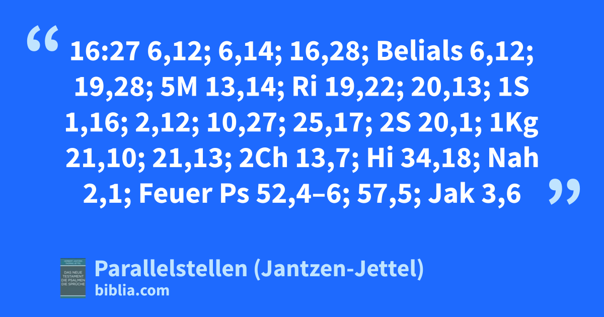 16:27 6,12; 6,14; 16,28; Belials 6,12; 19,28; 5M 13,14; Ri 19,22; 20,13; 1S 1,16; 2,12; 10,27; 25,17; 2S 20,1; 1Kg 21,10; 21,13; 2Ch 13,7; Hi 34,18; Nah 2,1; Feuer Ps 52,4–6; 57,5; Jak 3,6