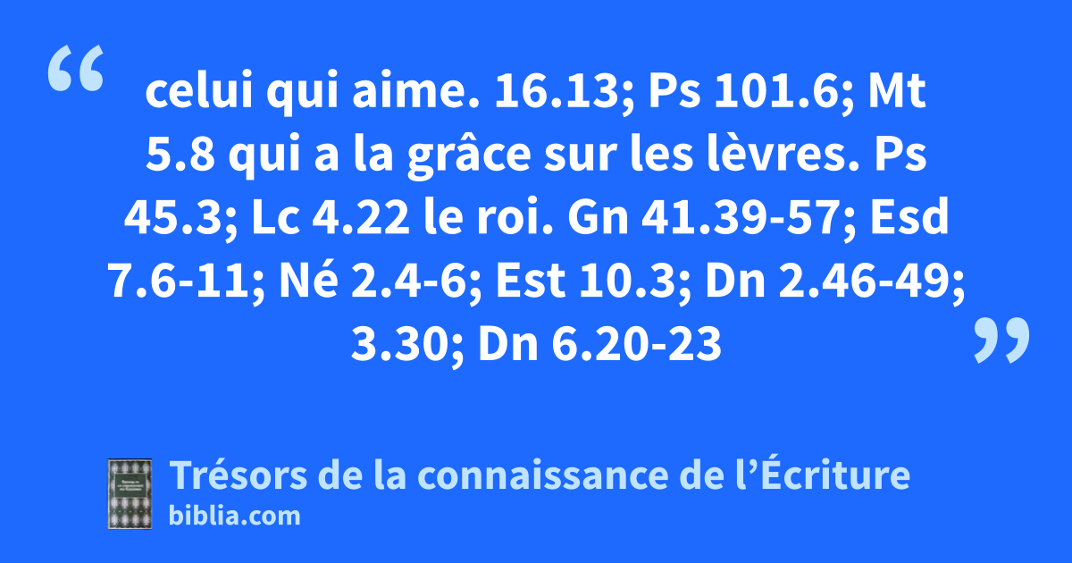 celui qui aime. 16.13; Ps 101.6; Mt 5.8 qui a la grâce sur les lèvres. Ps 45.3; Lc 4.22 le roi. Gn 41.39-57; Esd 7.6-11; Né 2.4-6; Est 10.3; Dn 2.46-49; 3.30; Dn 6.20-23