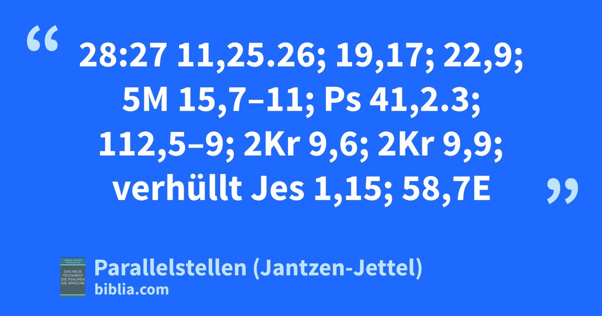 28:27 11,25.26; 19,17; 22,9; 5M 15,7–11; Ps 41,2.3; 112,5–9; 2Kr 9,6; 2Kr 9,9; verhüllt Jes 1,15; 58,7E