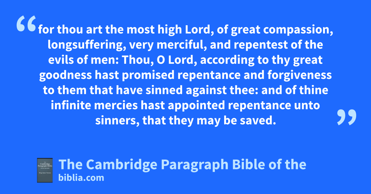 * O Lord, aAlmighty God of our fathers, Abraham, Isaac, and Jacob, and of their grighteous seed; 2 bwho hast made heaven and earth, with all the ornament thereof; 3 bwho hast bound the sea by the word of thy commandment; who hast shut up the deep, and sealed it by thy terrible and glorious name; 4 whom all men fear, and tremble before thy power; 5 for the majesty of thy glory cannot be borne, and thine angry threatening towards sinners is importable; 6 but thy merciful promise is unmeasurable and cunsearchable; 7 for thou art the most high Lord, of degreat compassion, longsuffering, very merciful, eand repentest of the evils of men: Thou, O Lord, according to thy great goodness hast promised repentance and forgiveness to them that have sinned against thee: and of thine infinite mercies hast appointed frepentance unto sinners, fthat they may be saved.